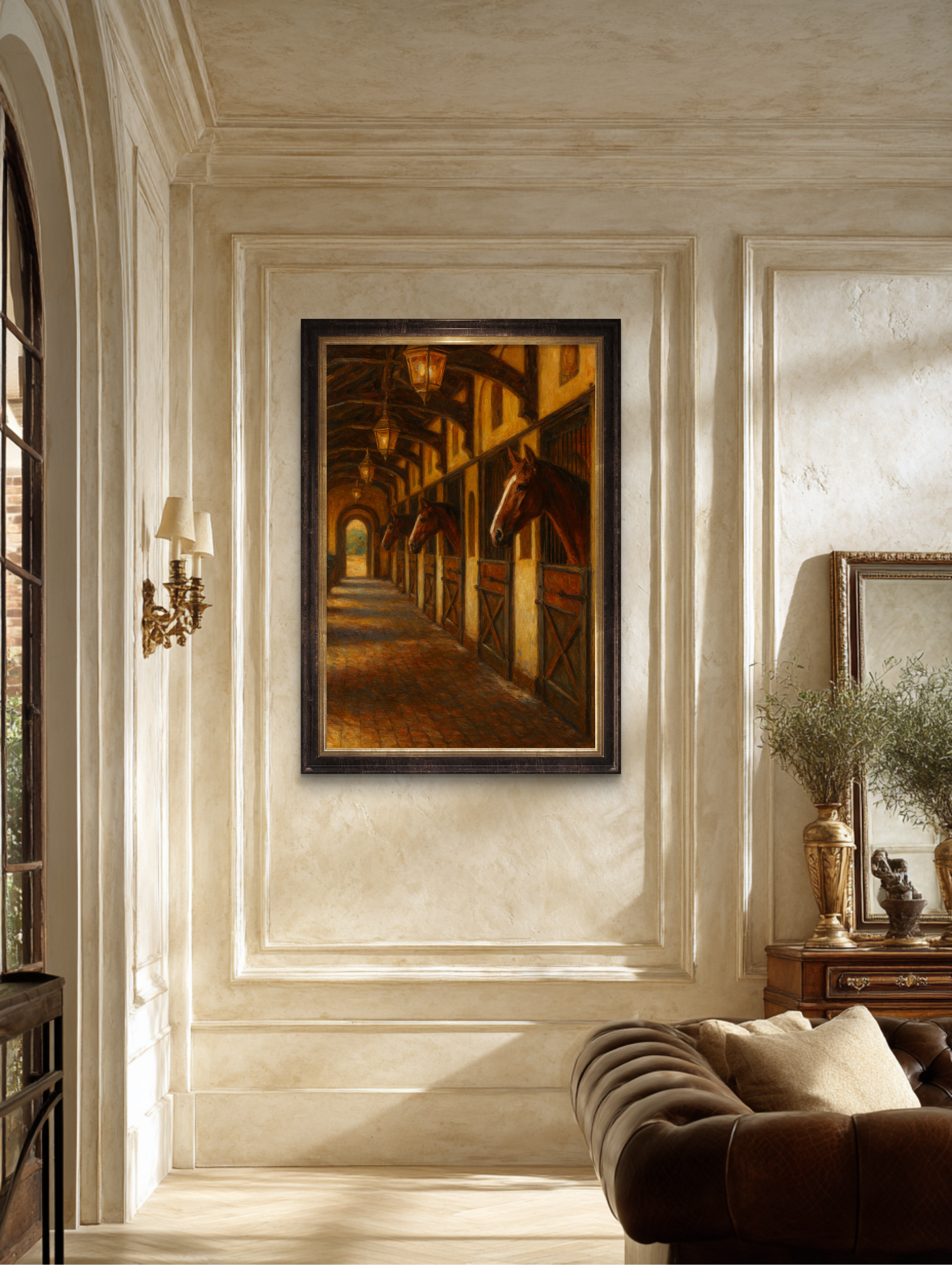 There’s a certain hush that falls over a well-built stable just before dusk, the kind of silence that suggests everything is in its proper place and everyone knows their duty. The Barn captures that precise moment. The amber light filtering through, the rhythmic line of noble heads extending from polished stalls, the scent of hay and leather lingering just out of frame, it all combines into a portrait of equestrian serenity and understated authority.
