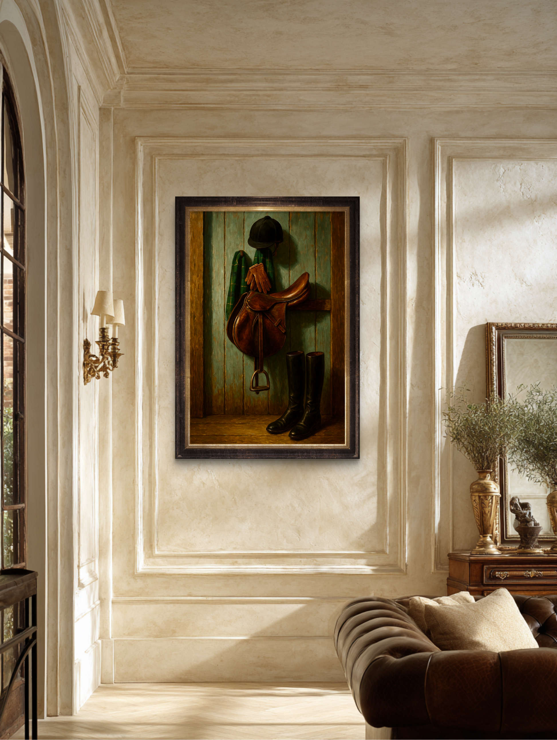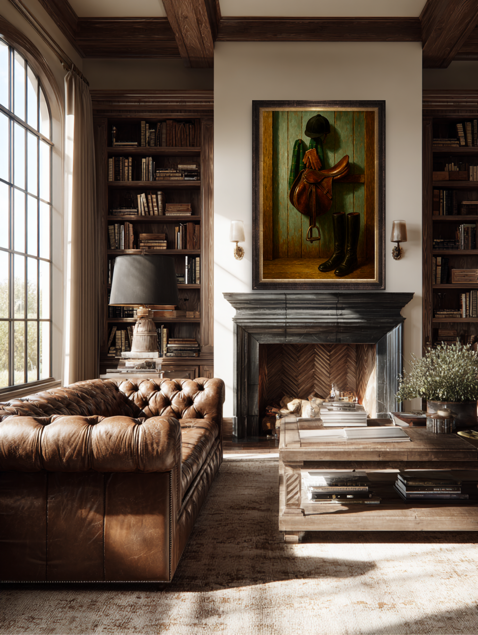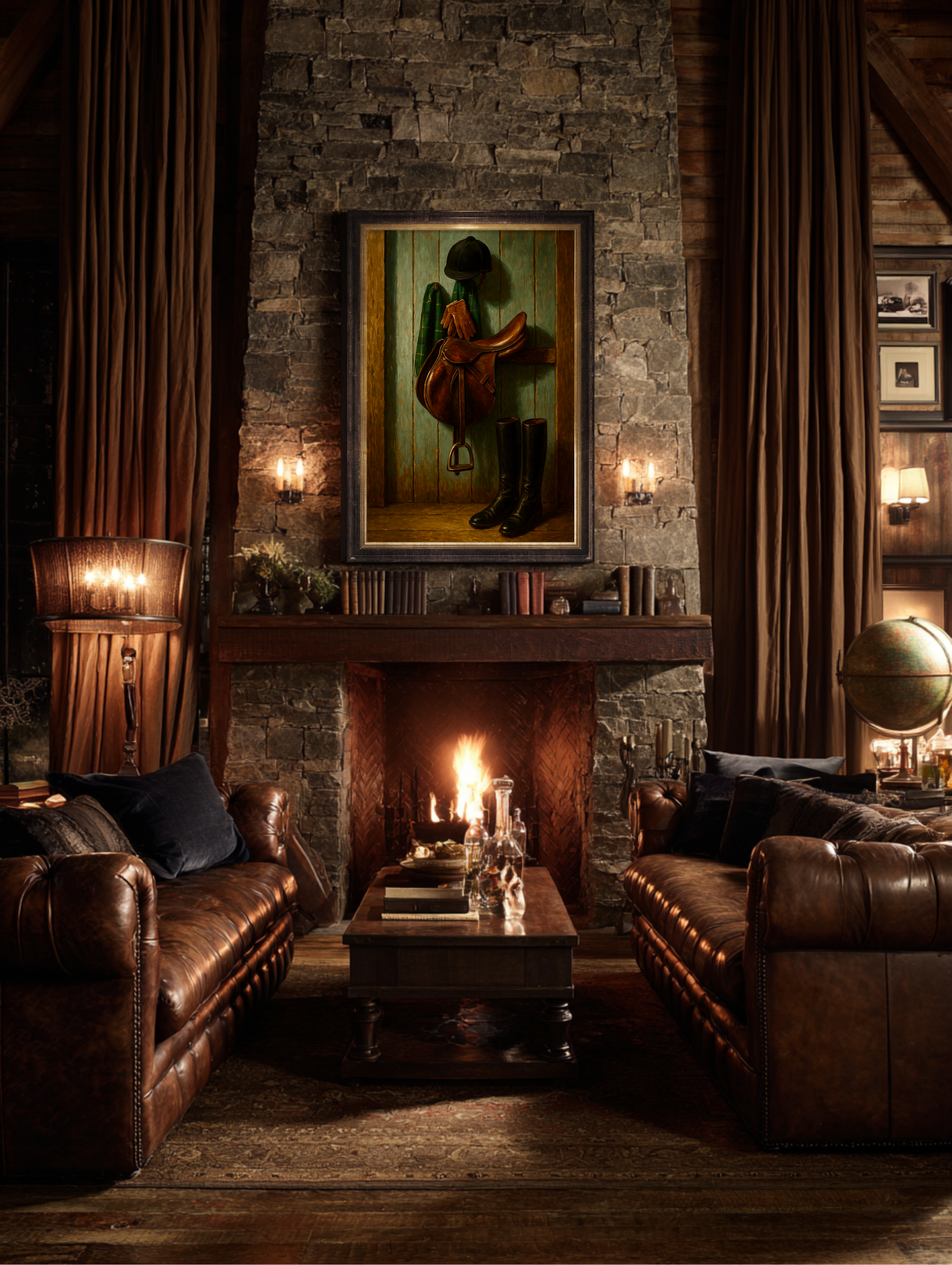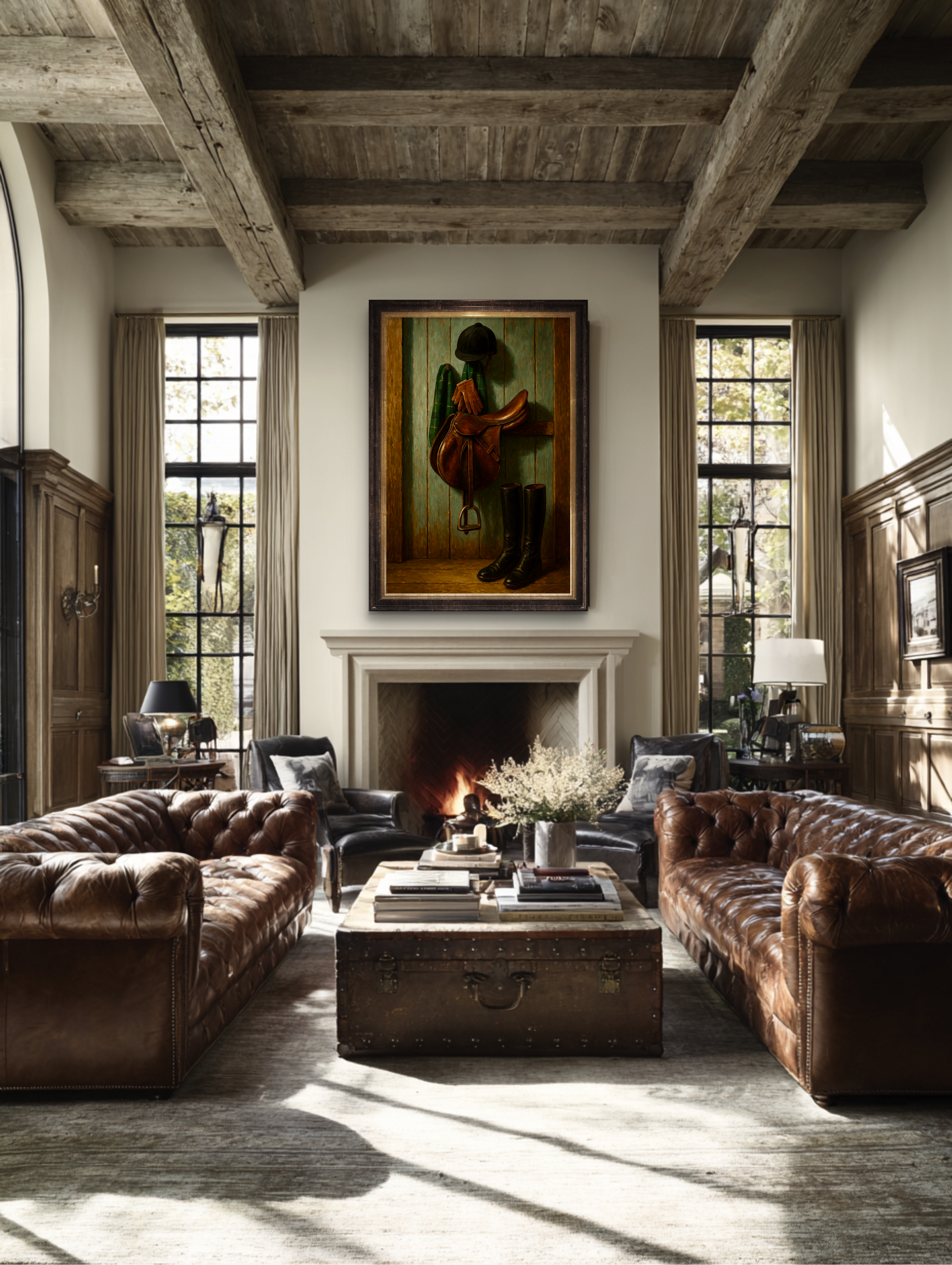 This is not simply a painting. It’s a declaration of taste, a reminder that the best things in life smell faintly of leather, oak, and resolve. Best displayed above a fireplace, in a paneled study, or along a grand hallway where the light falls just right, it brings that unmistakable warmth and permanence found only in country estates, coastal retreats, and gentleman’s libraries.