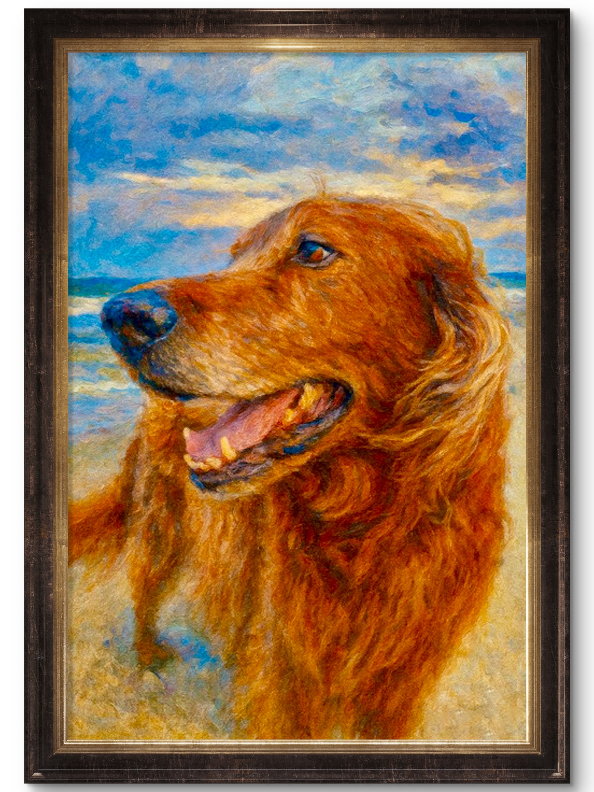 Created through a series of artistic AI prompts, Kelly at the Beach is an old master–inspired oil painting reborn through modern technology, a timeless work destined to become a family heirloom.