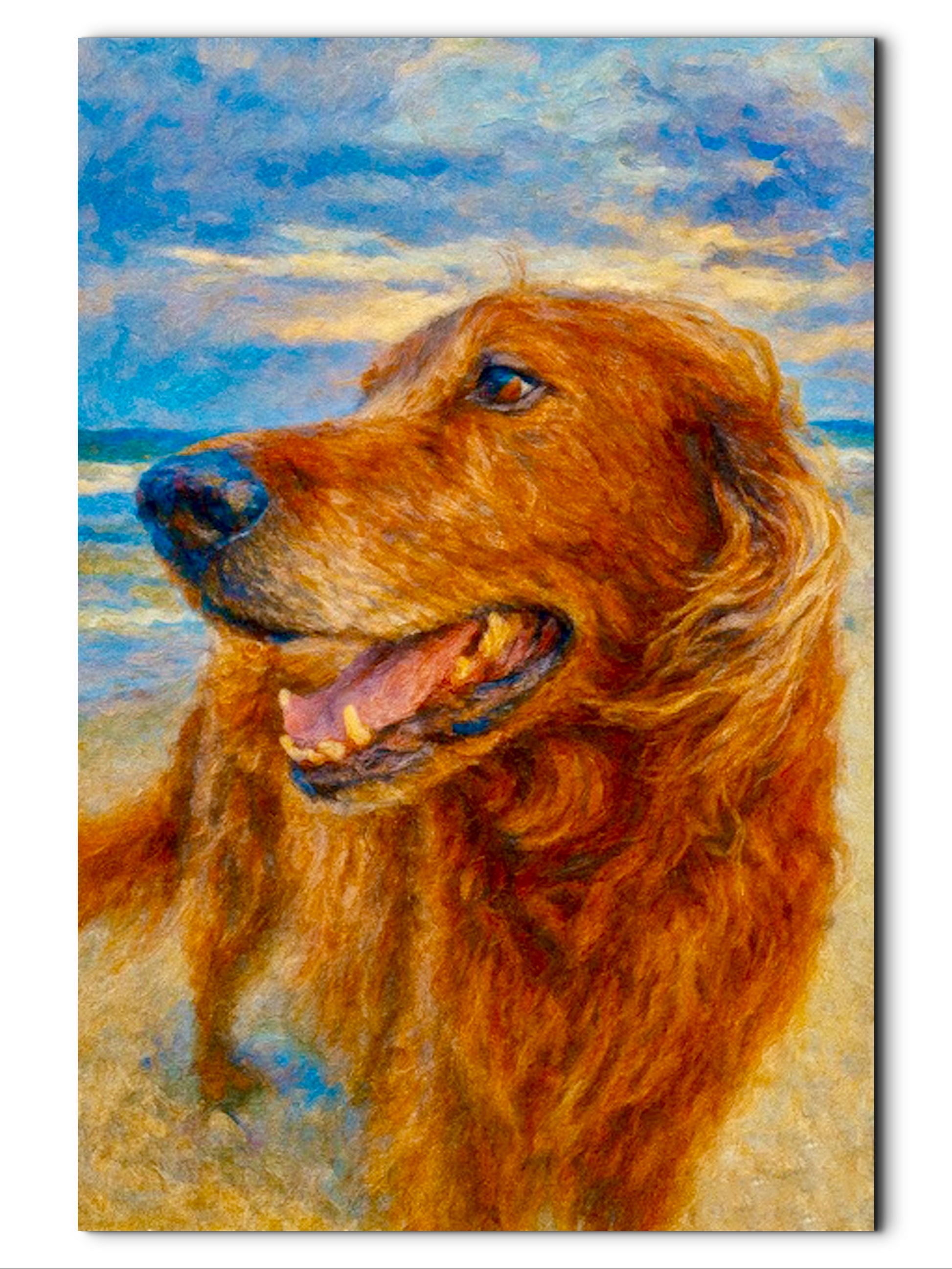 There are dogs, and then there are Irish Setters, creatures seemingly dipped in sunlight and born to run where sea and sky collide. Kelly at the Beach captures that rare combination of joy and dignity found only in a dog who knows he's magnificent. The wind teases his auburn coat, the surf hums approval, and for one moment, the world is exactly as it should be.