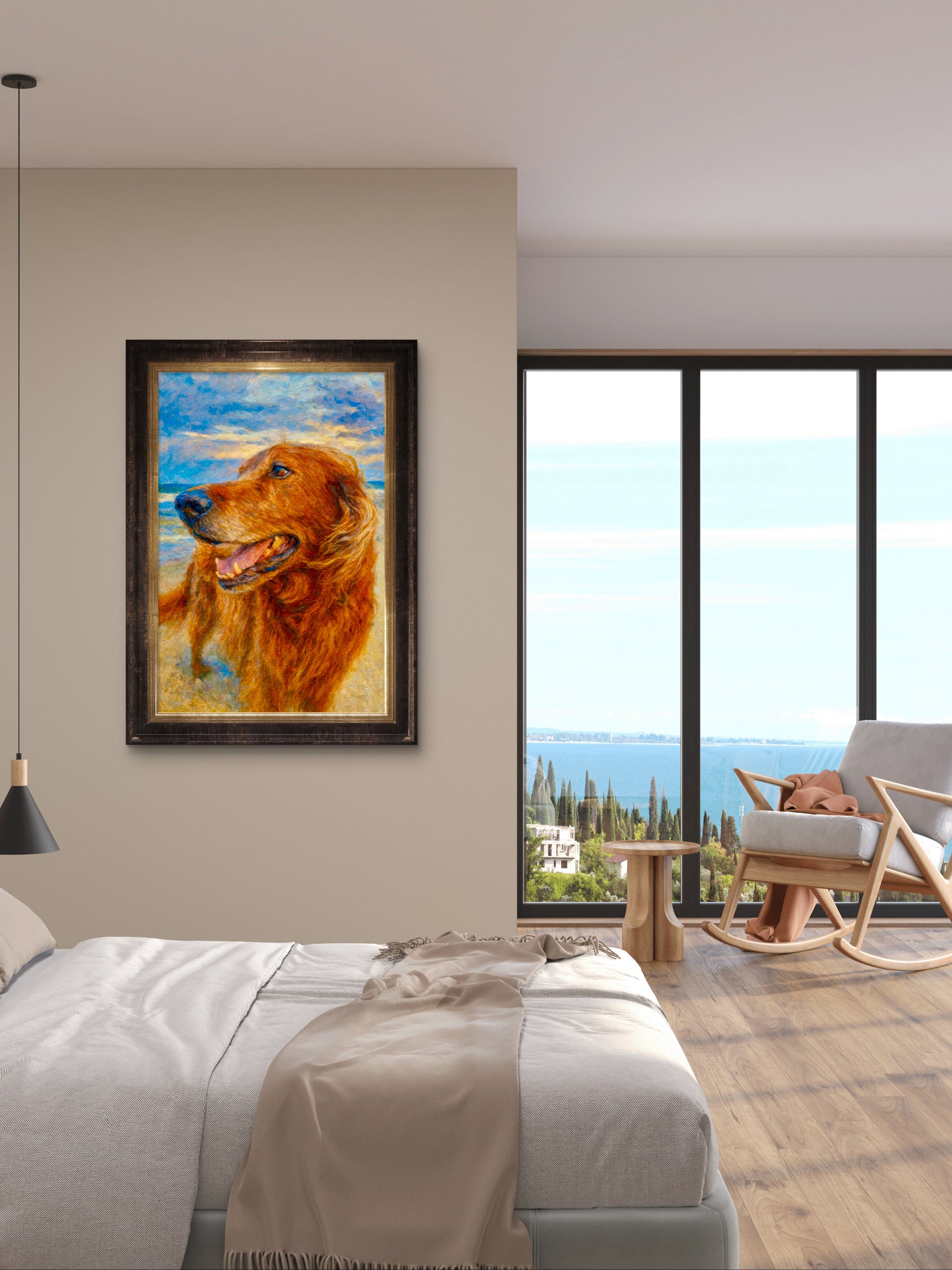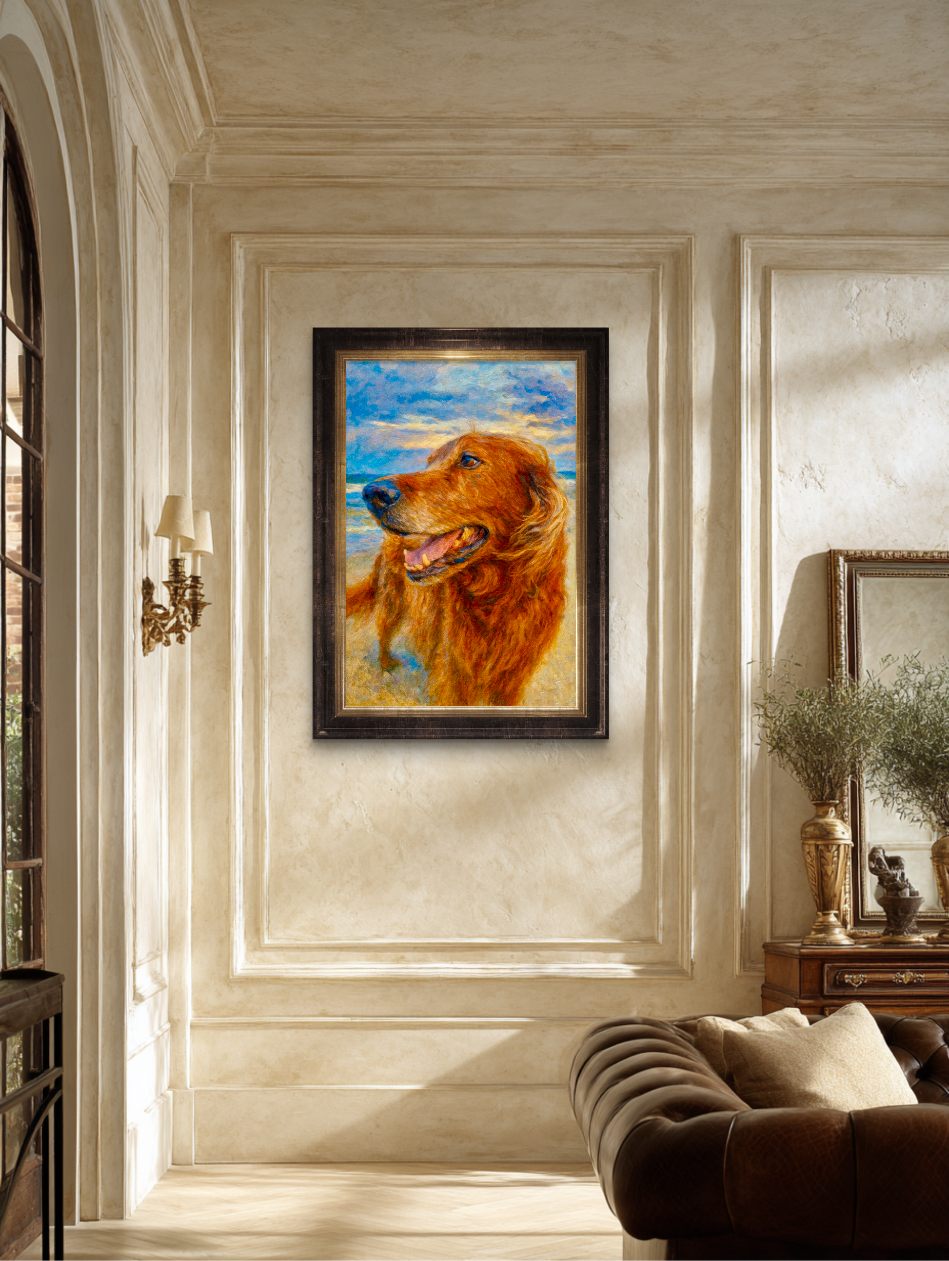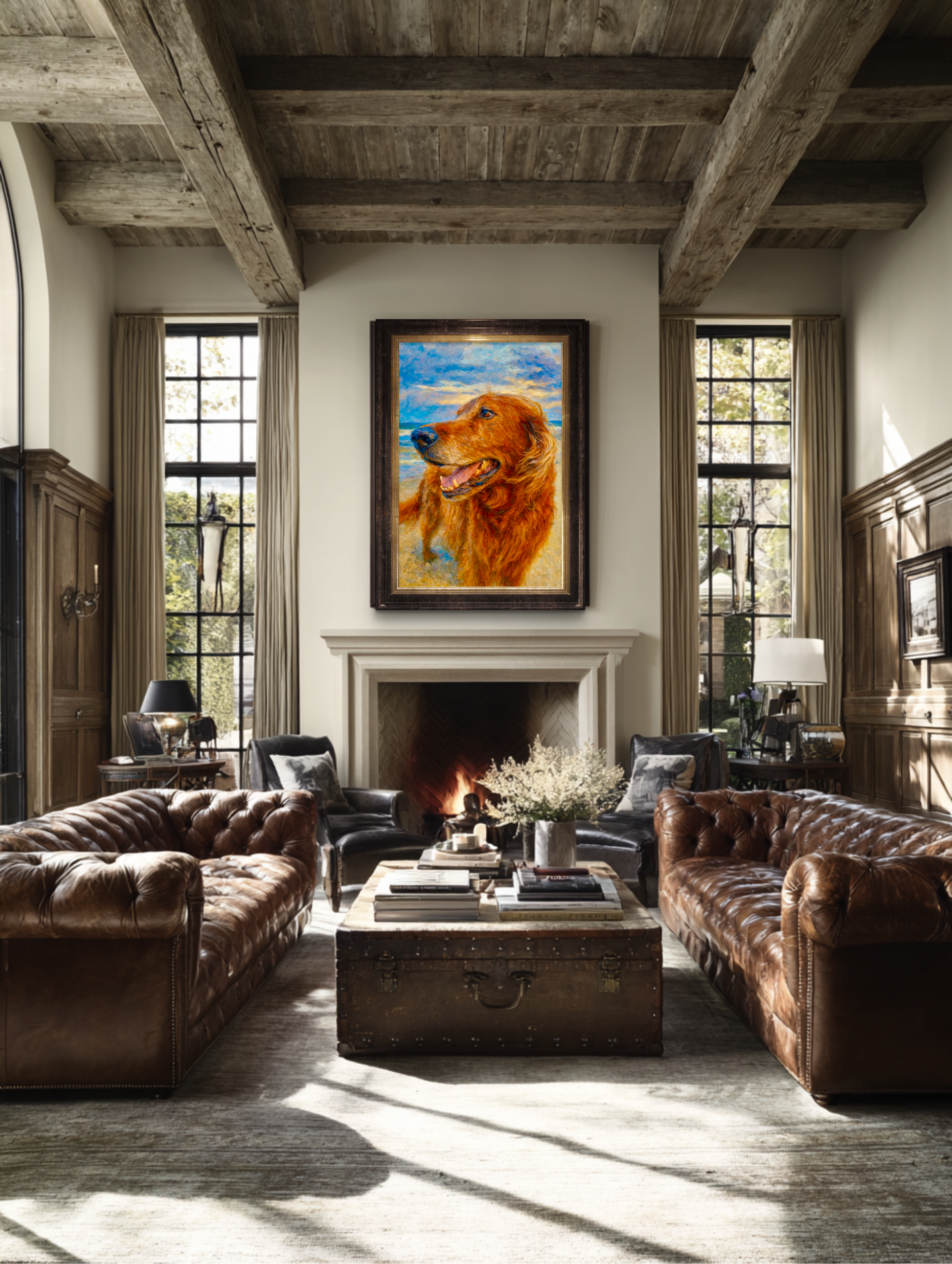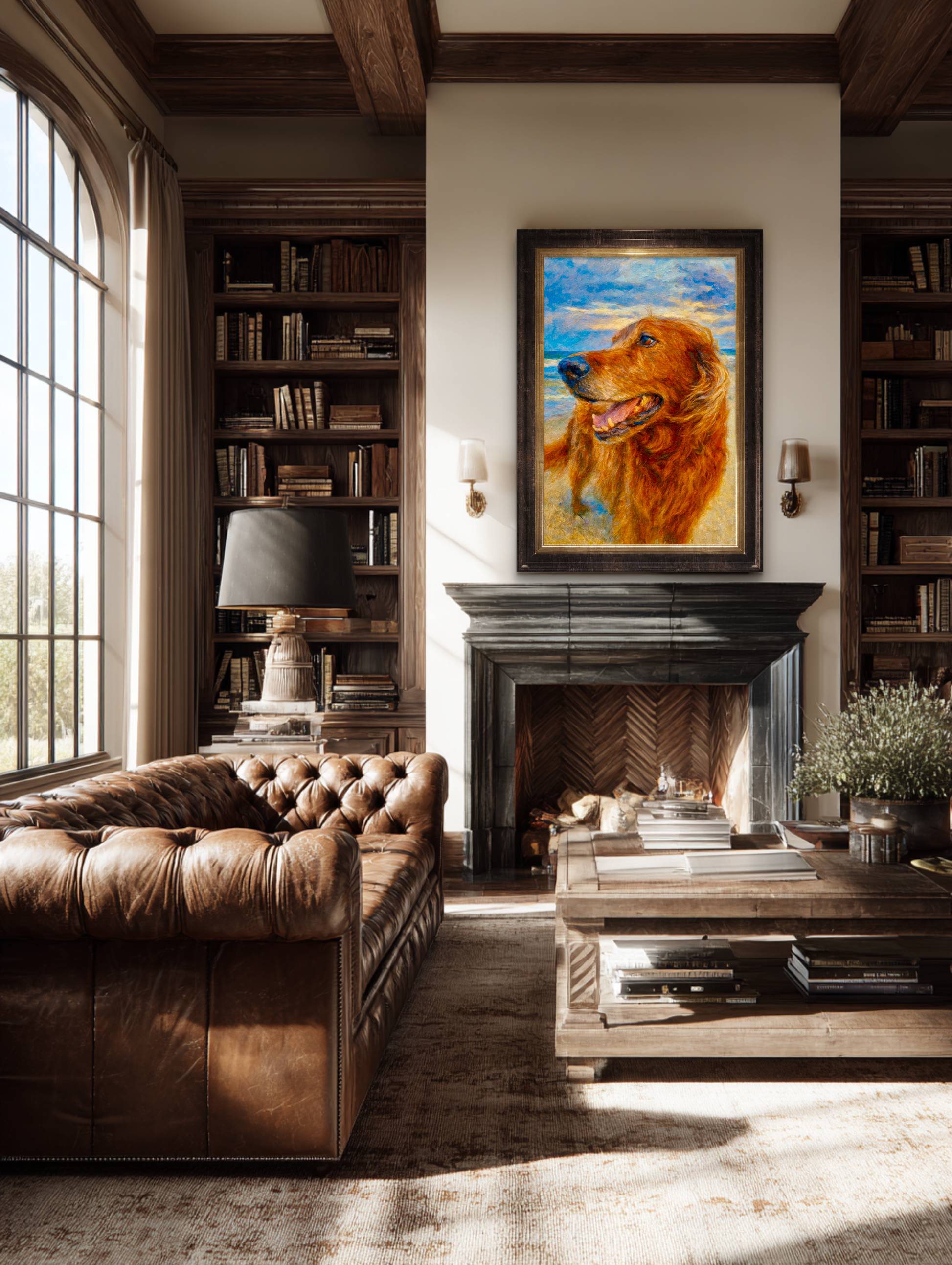 This painting is not background décor, it’s a statement piece. Best displayed above a roaring fireplace, in a paneled study, or along a grand hallway where sunlight can catch the gold in his fur. It adds that unmistakable air of old-world luxury, the warmth and permanence found in country estates, coastal retreats, and gentleman’s libraries.