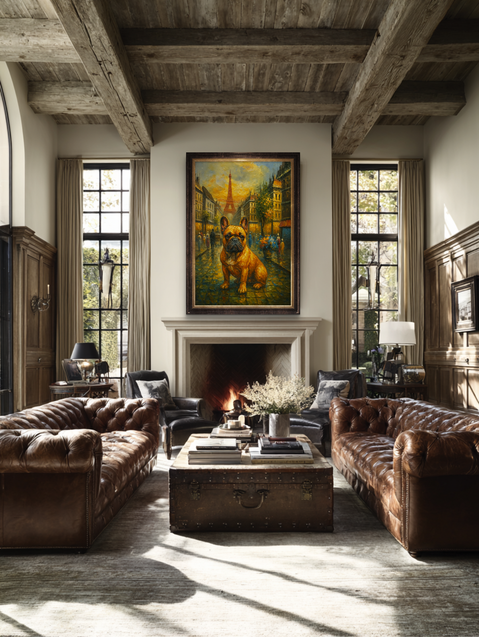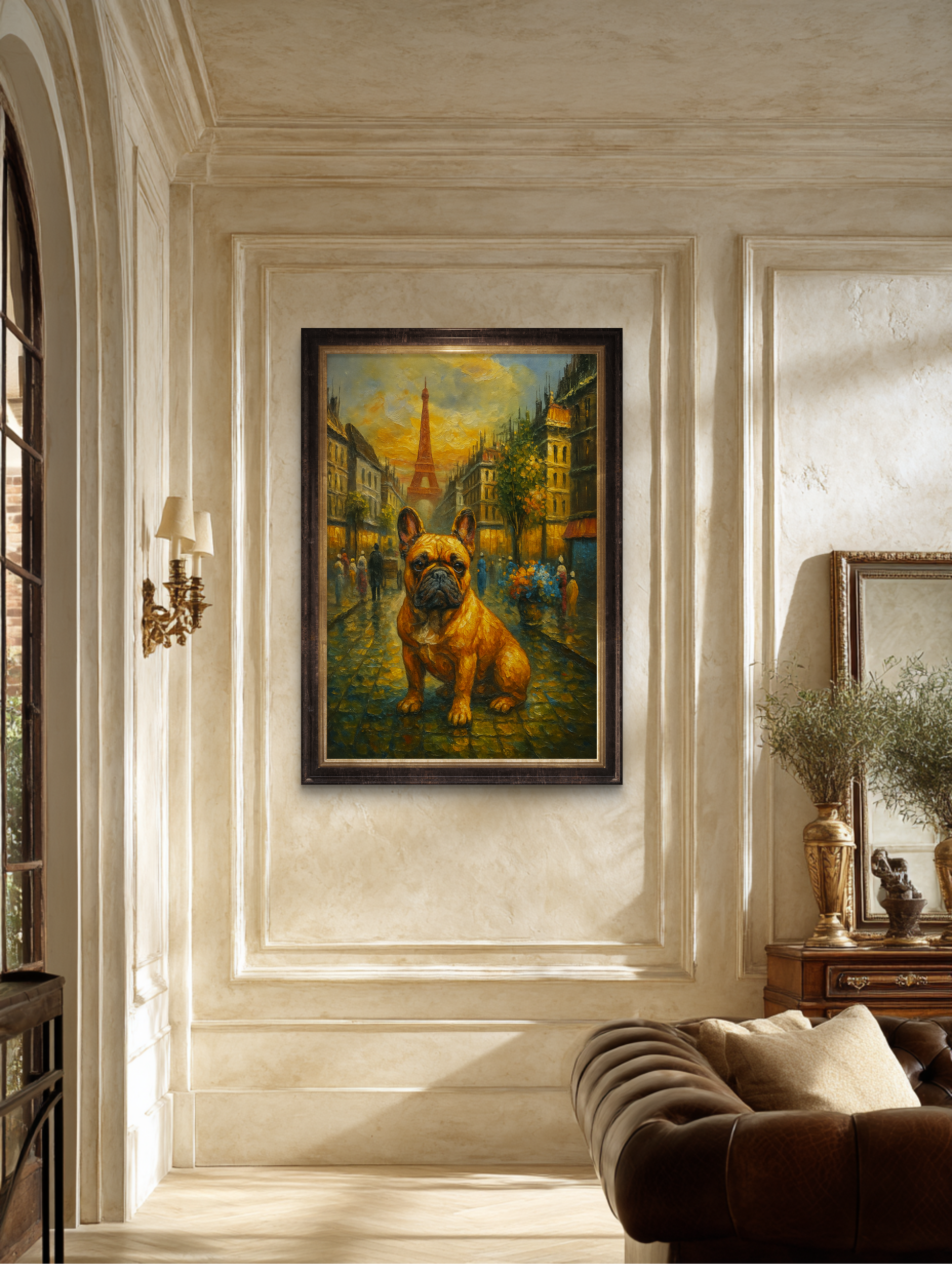 Somewhere between romance and absurdity, a French Bulldog has claimed Paris. Set against a dusky Parisian boulevard, the Eiffel Tower glows faintly in the distance as this stout, self-assured fellow holds court in the middle of the cobblestone street — unmoved by pedestrians, unbothered by time, and clearly aware he’s the true monument of the city. The amber tones and painterly texture recall the work of Old Masters, with enough warmth and depth to fill a paneled study, a gentleman’s library, or that impossibly perfect wall above the fireplace. Wherever it hangs, this painting lends that sense of old-world permanence and quiet luxury one only finds in country estates and coastal retreats.