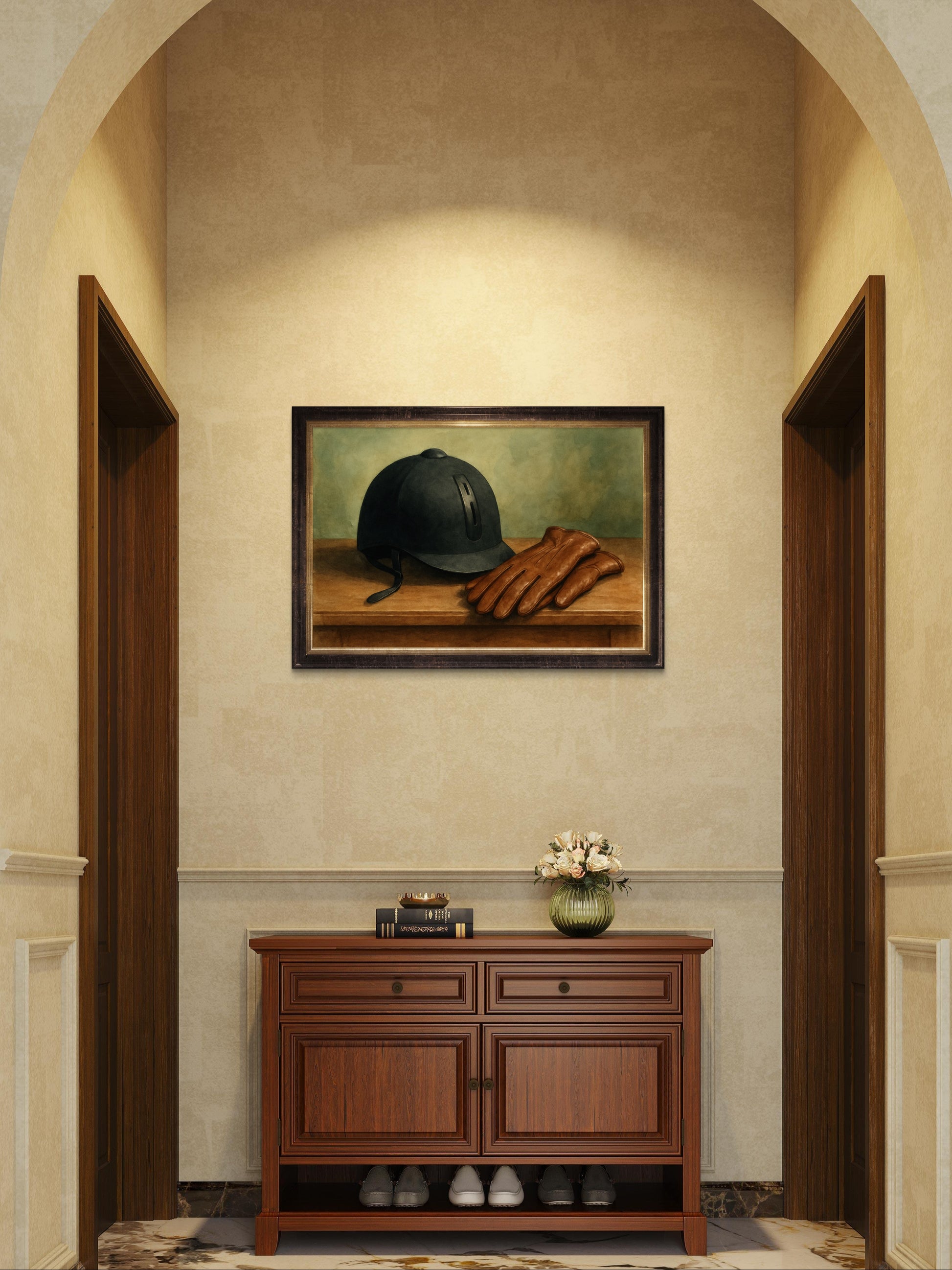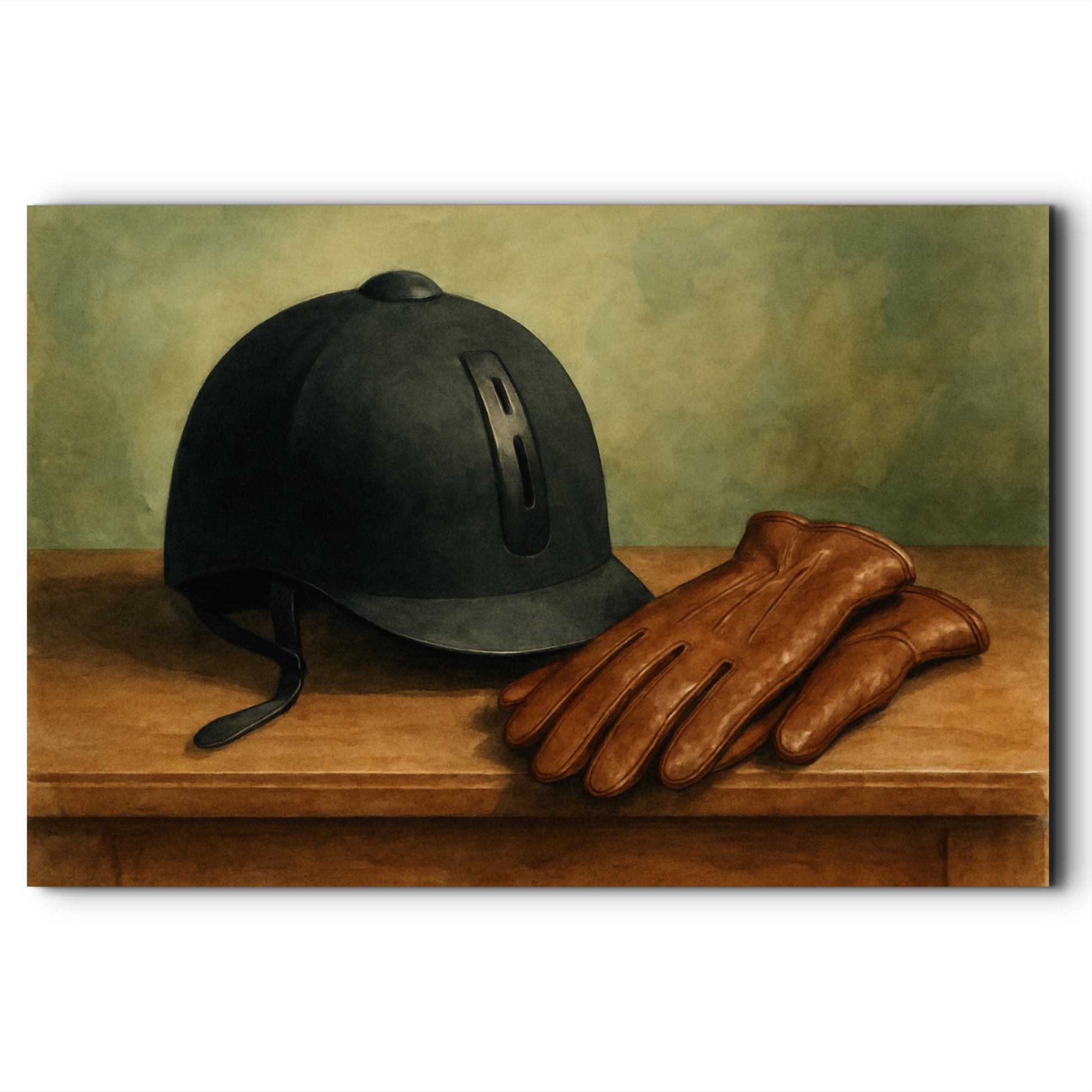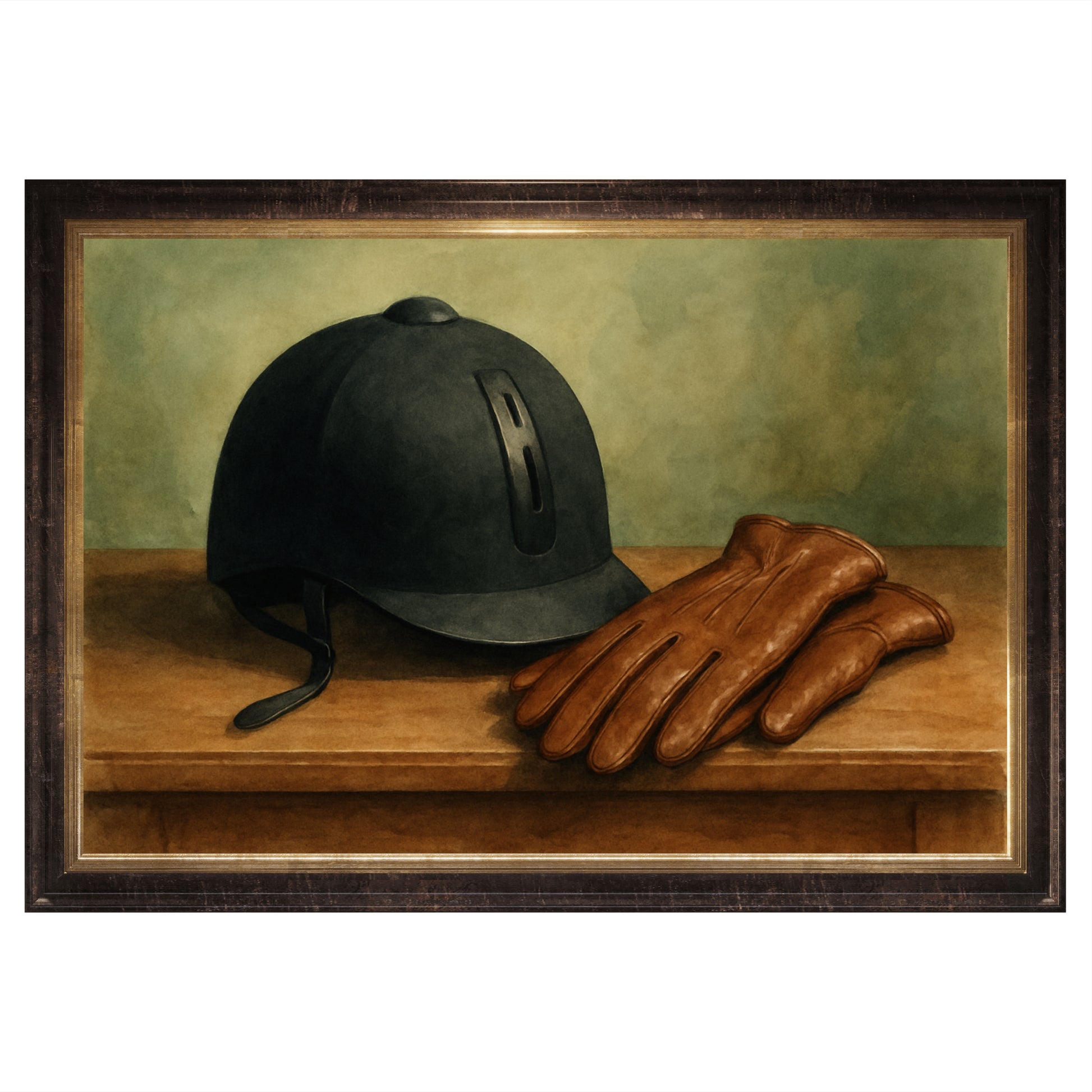 There’s something quietly commanding about this composition, the way a well-worn pair of riding gloves rests beside a black equestrian helmet, as though the rider has just stepped out for a final trot before dusk. The tones are warm, the stillness intentional. It’s the sort of painting that feels perfectly at home above a fireplace, in a paneled study lined with leather-bound books, or along a grand hallway where light falls just so.