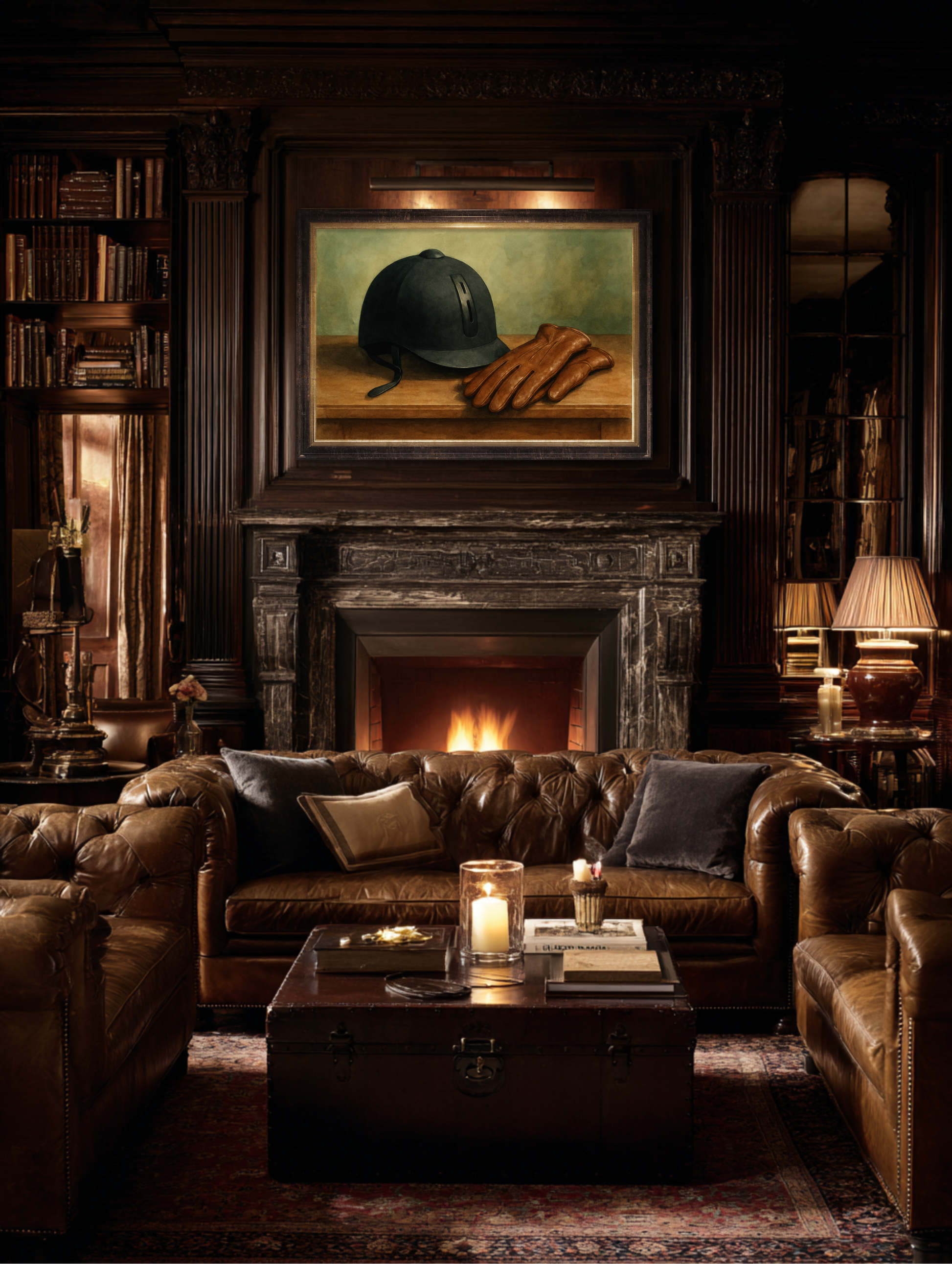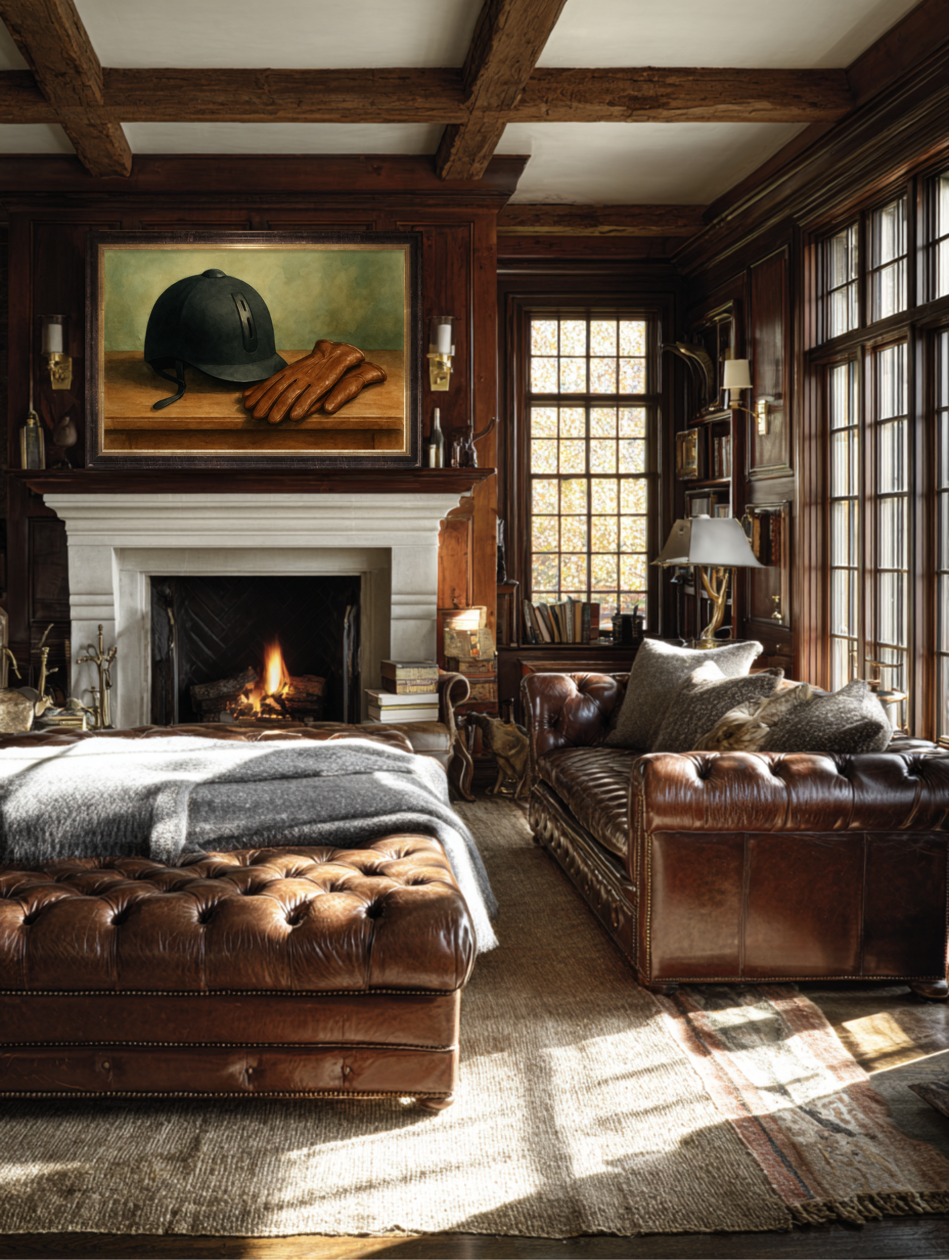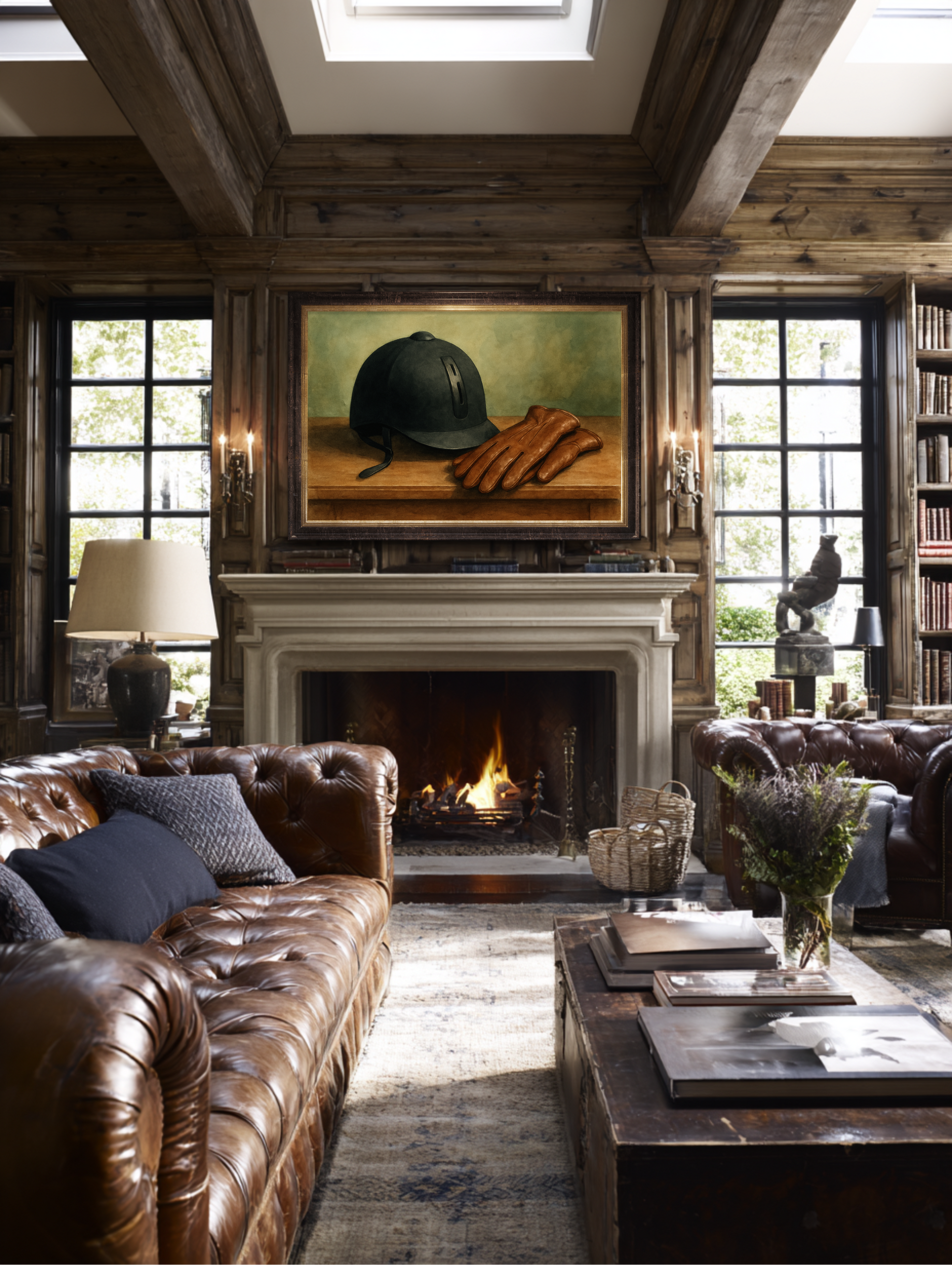 There’s something quietly commanding about this composition, the way a well-worn pair of riding gloves rests beside a black equestrian helmet, as though the rider has just stepped out for a final trot before dusk. The tones are warm, the stillness intentional. It’s the sort of painting that feels perfectly at home above a fireplace, in a paneled study lined with leather-bound books, or along a grand hallway where light falls just so.