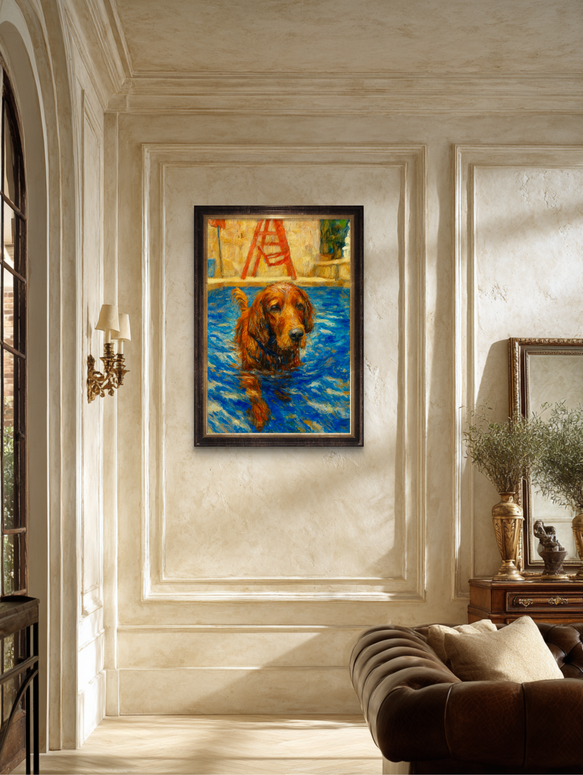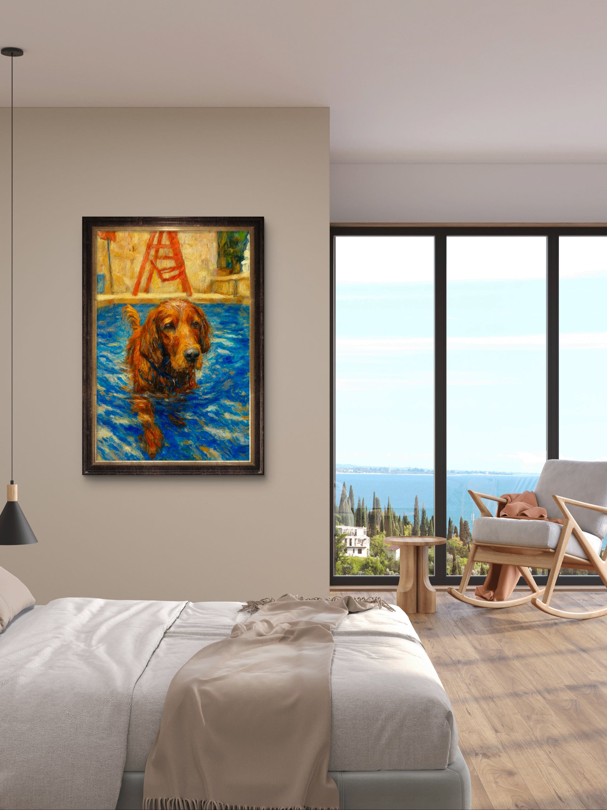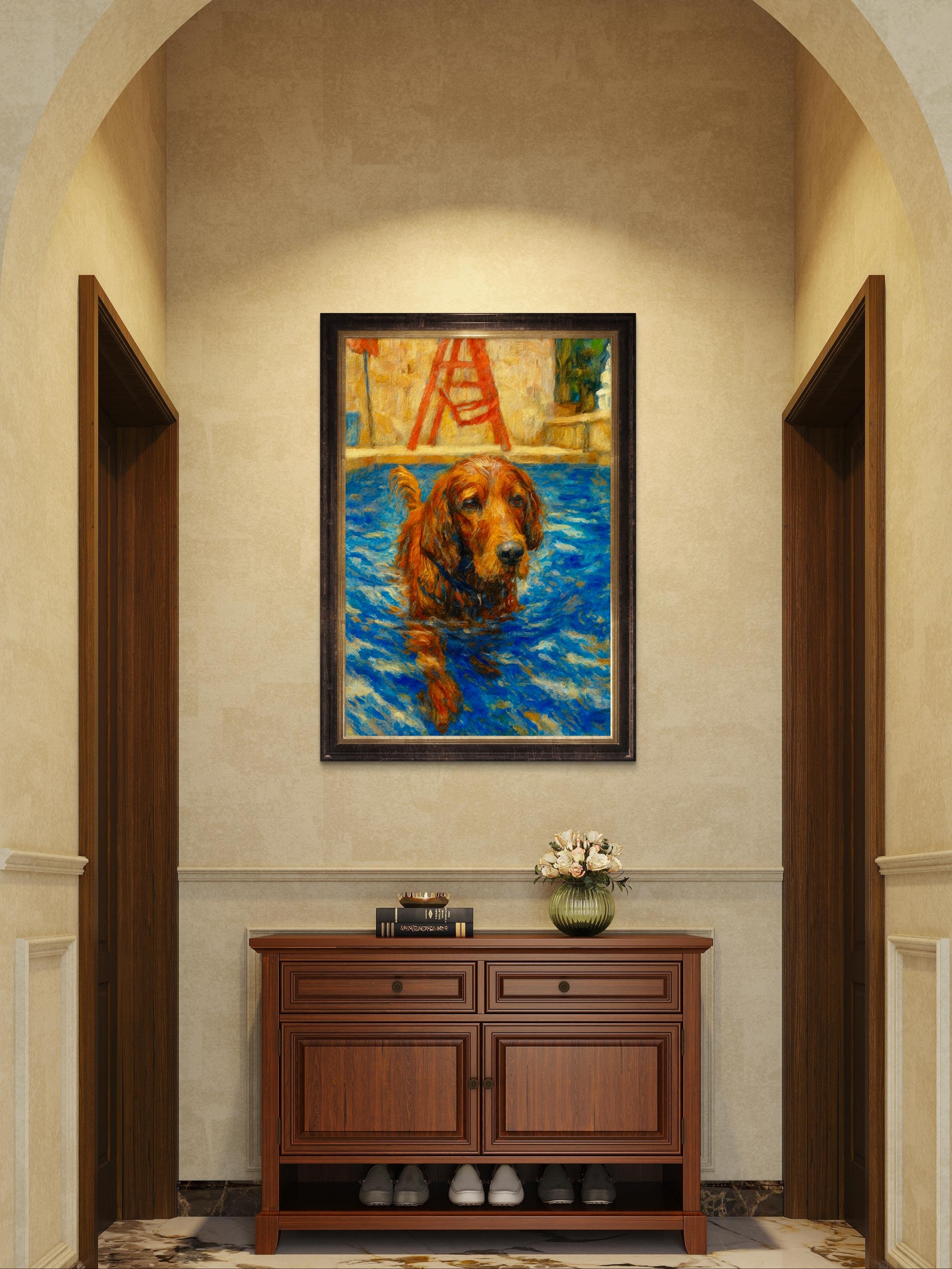 Here, an Irish Setter, part aristocrat, part rascal, wades chest-deep in a pool that was, quite certainly, not intended for dogs. The sunlight glances off russet fur like polished copper, the water swirling in painterly strokes of ultramarine and sapphire. Behind him, a red lifeguard chair and towel hint at human order, now quietly commandeered by something far more dignified.