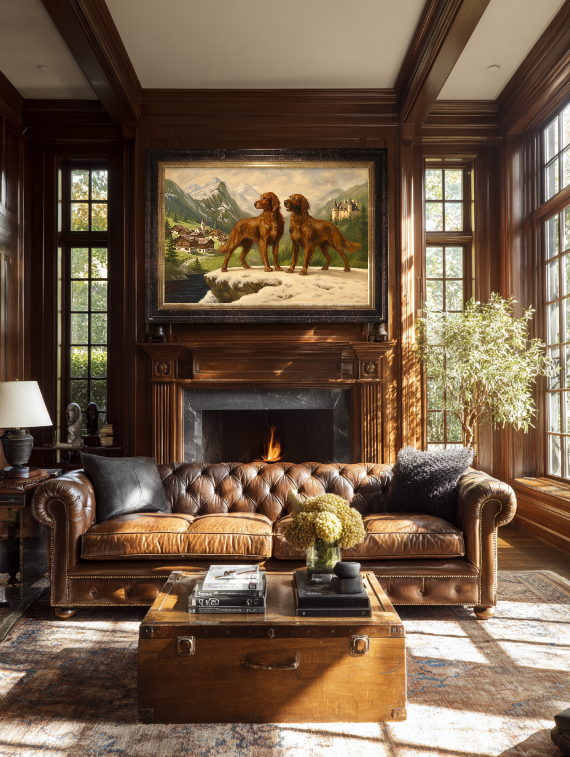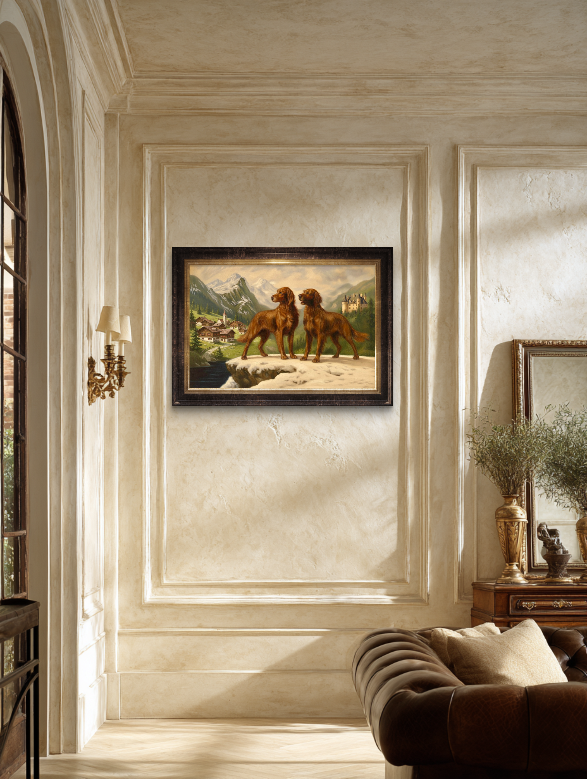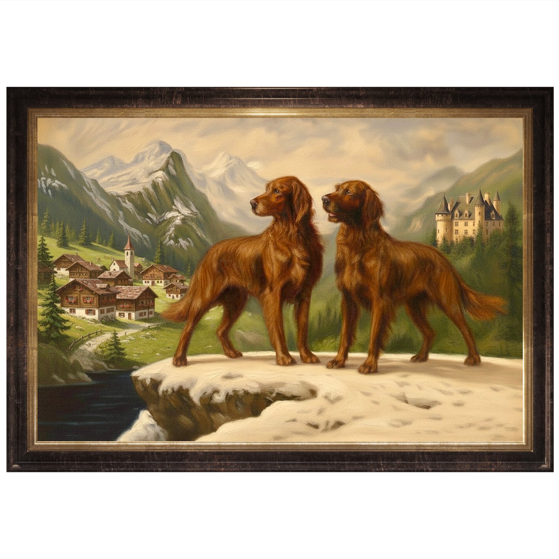 This AI-generated fine art piece was created through a series of special artistic prompts, blending modern technology with timeless craftsmanship. The result is a Giclée gallery-quality Irish Setter art print on canvas, where every detail — from the sheen of their coats to the distant alpine haze, evokes the romance of traditional oil paintings.