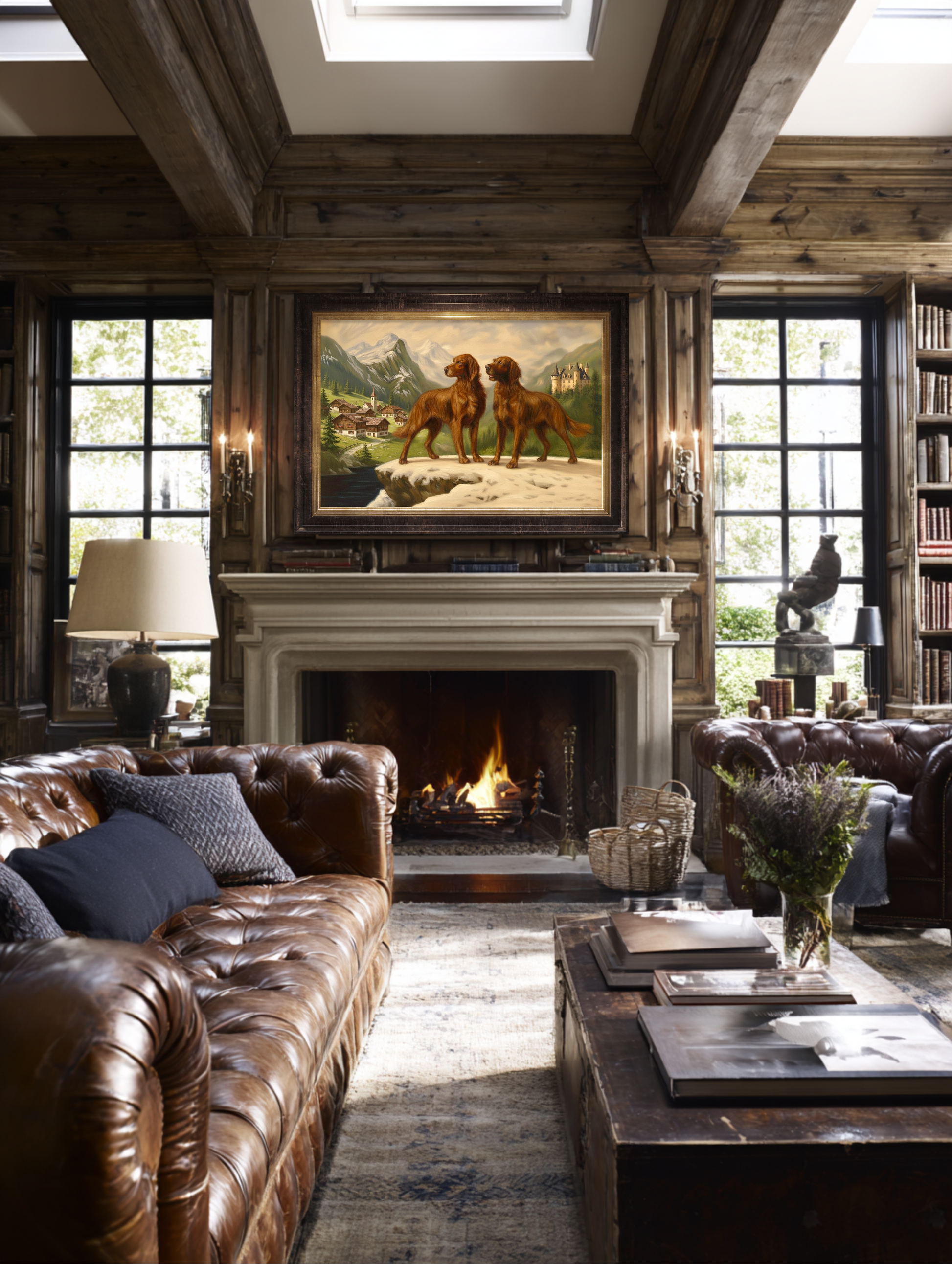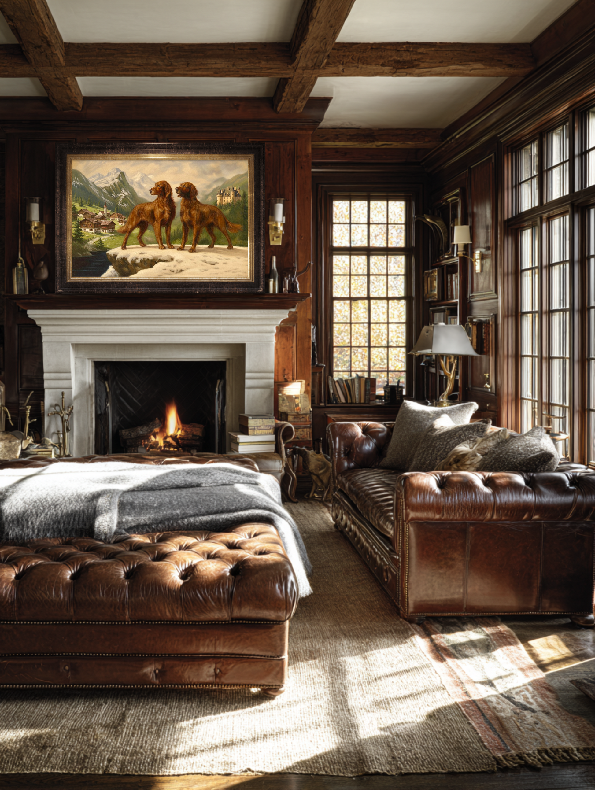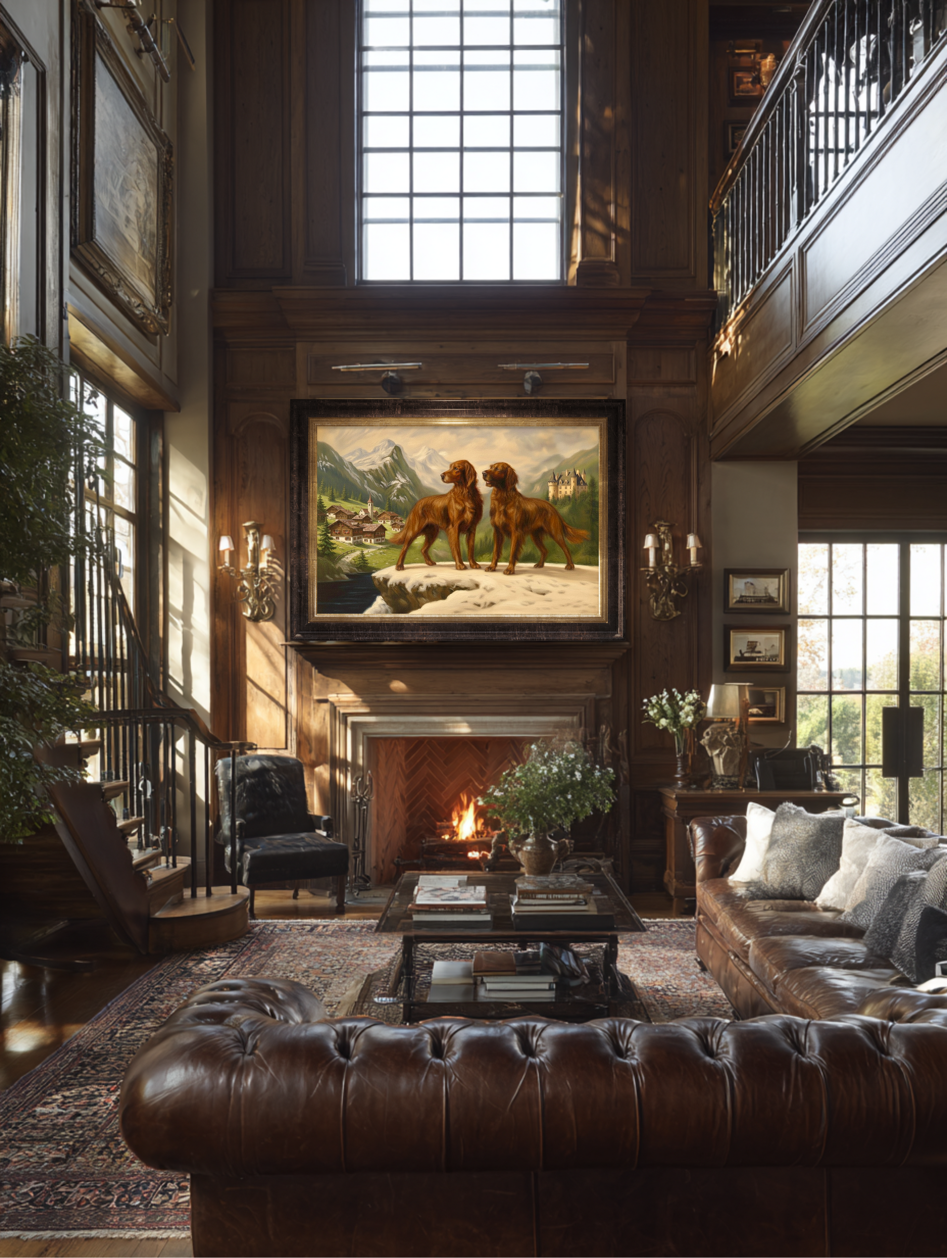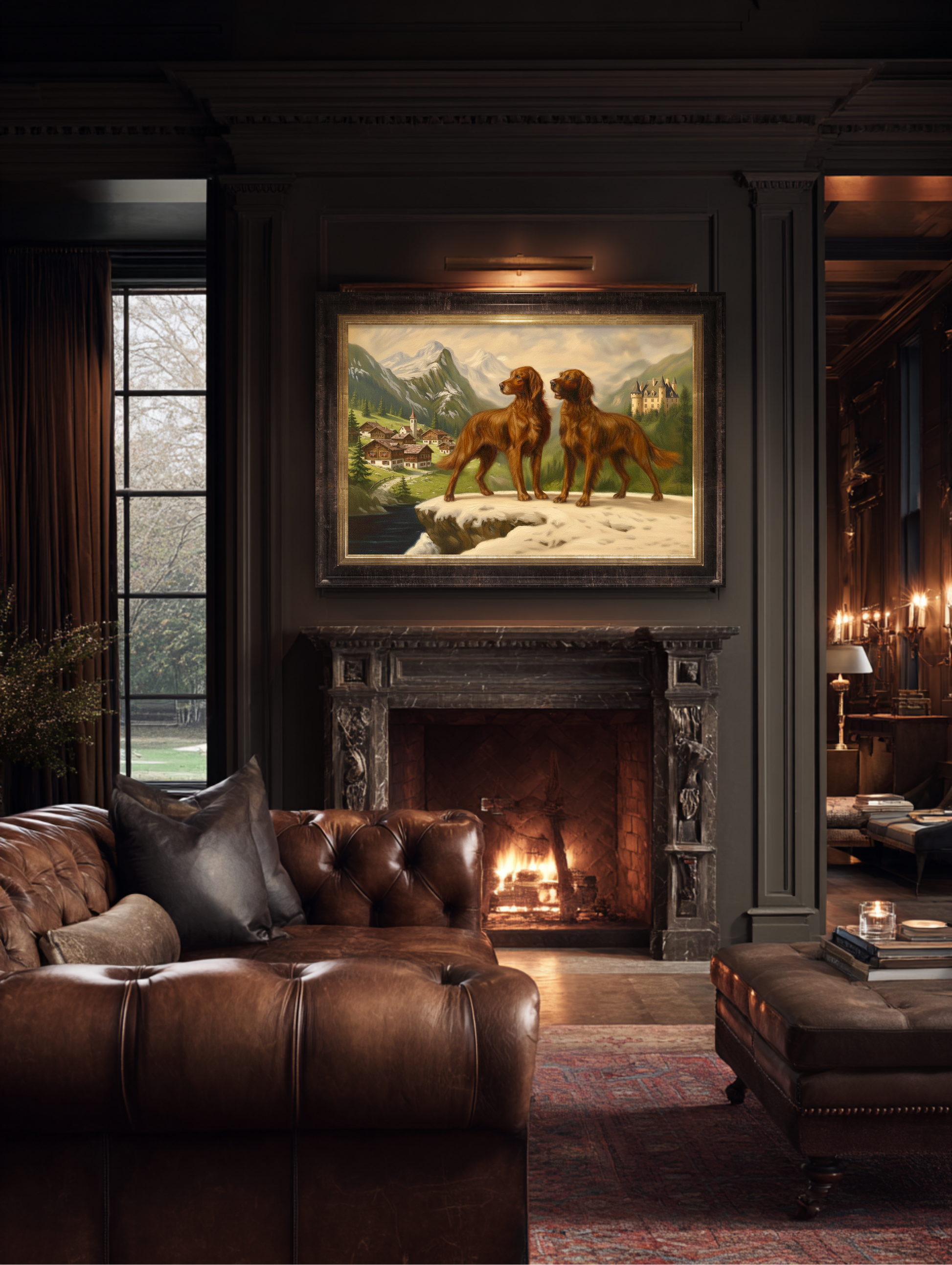 This AI-generated fine art piece was created through a series of special artistic prompts, blending modern technology with timeless craftsmanship. The result is a Giclée gallery-quality Irish Setter art print on canvas, where every detail — from the sheen of their coats to the distant alpine haze, evokes the romance of traditional oil paintings.