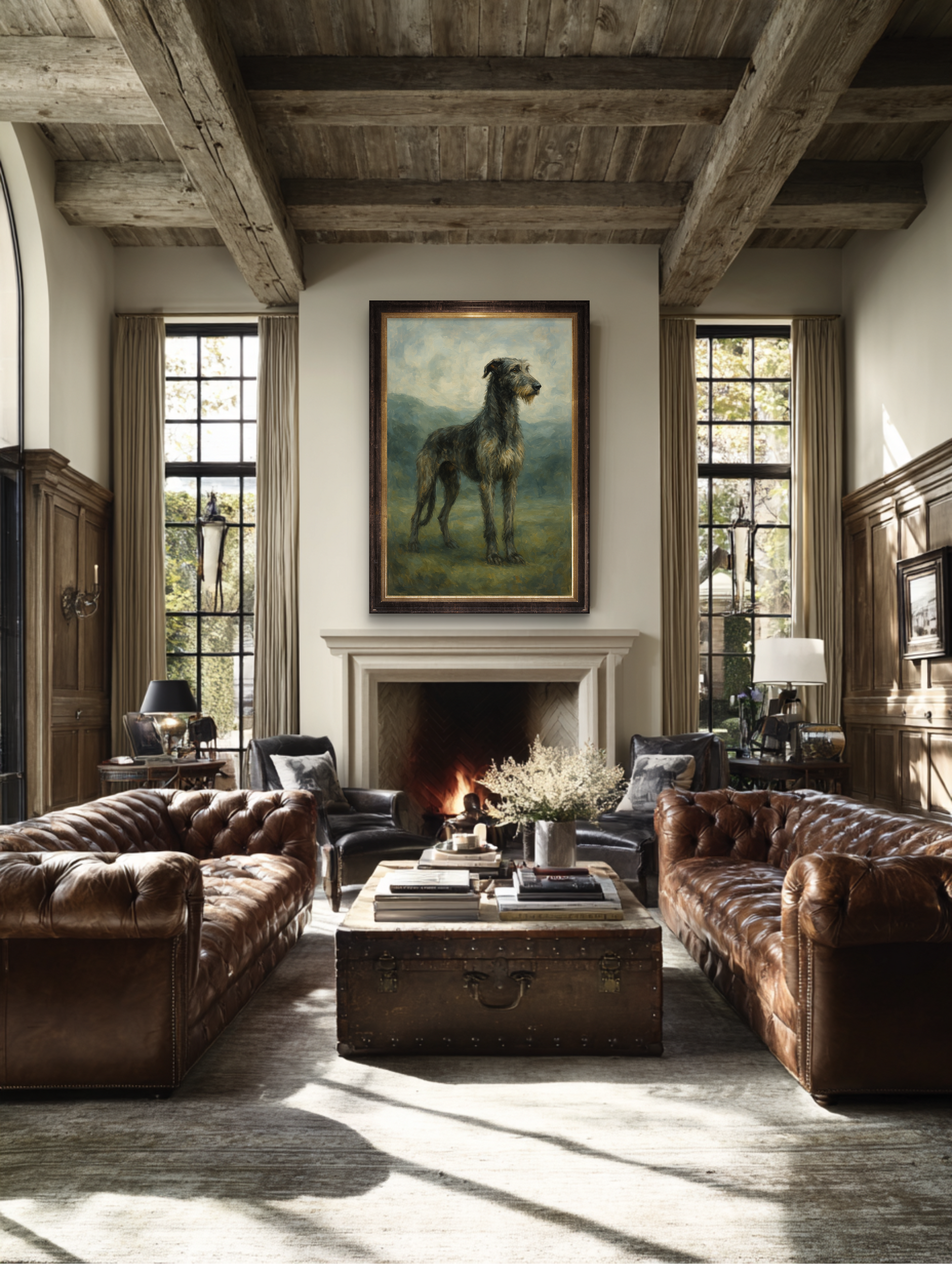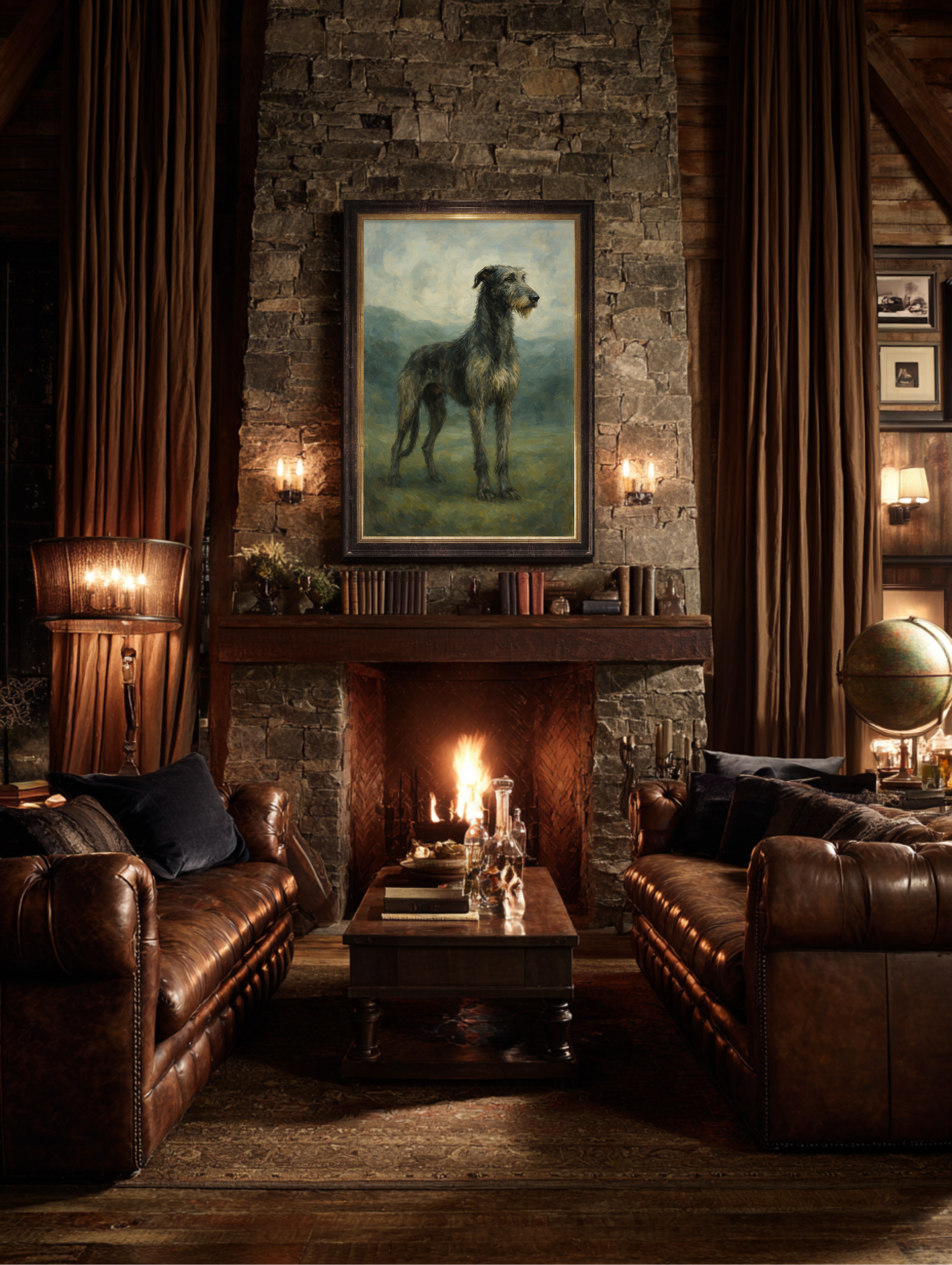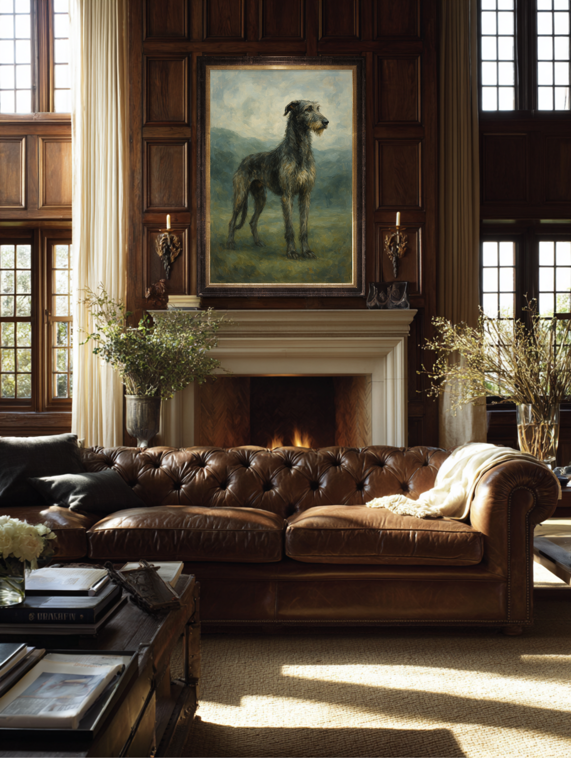 There are dogs, and then there is Seamus, a creature seemingly carved from fog and legend. The Irish Wolfhound, regal as a Highland stag and twice as proud, stands against the muted greens and greys of the moors, gazing somewhere just beyond civilization. This oil painting captures not merely a dog, but a legacy, a statement piece that belongs above a roaring fireplace, in a paneled study scented faintly of leather and ambition, or along a grand hallway where footsteps echo with purpose.