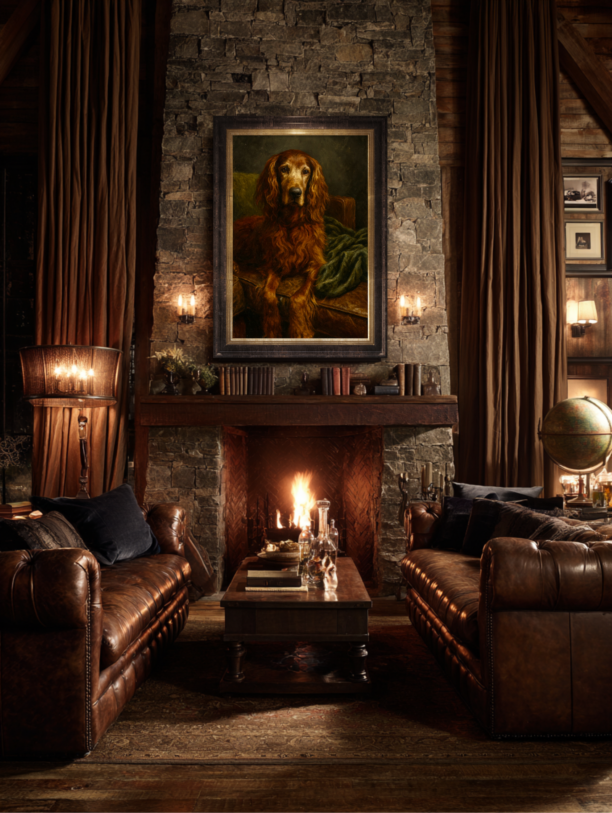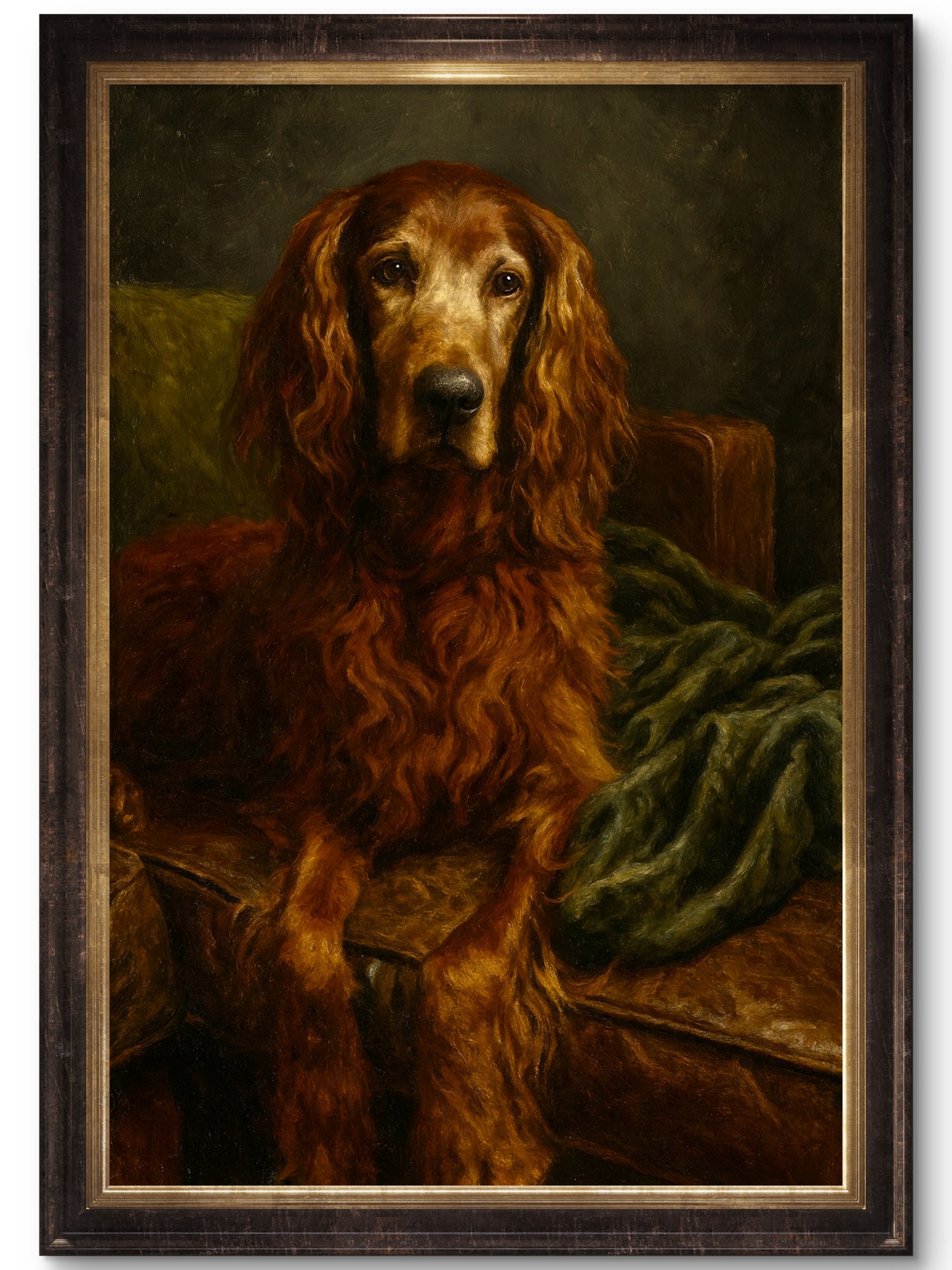 He doesn’t fetch. He hosts. With the quiet dignity of a country squire, this Irish Setter commands the room, one paw draped over the arm of a well-worn leather sofa, the faintest glimmer of candlelight brushing across his russet coat. It’s not simply a painting, it’s an introduction to better company.