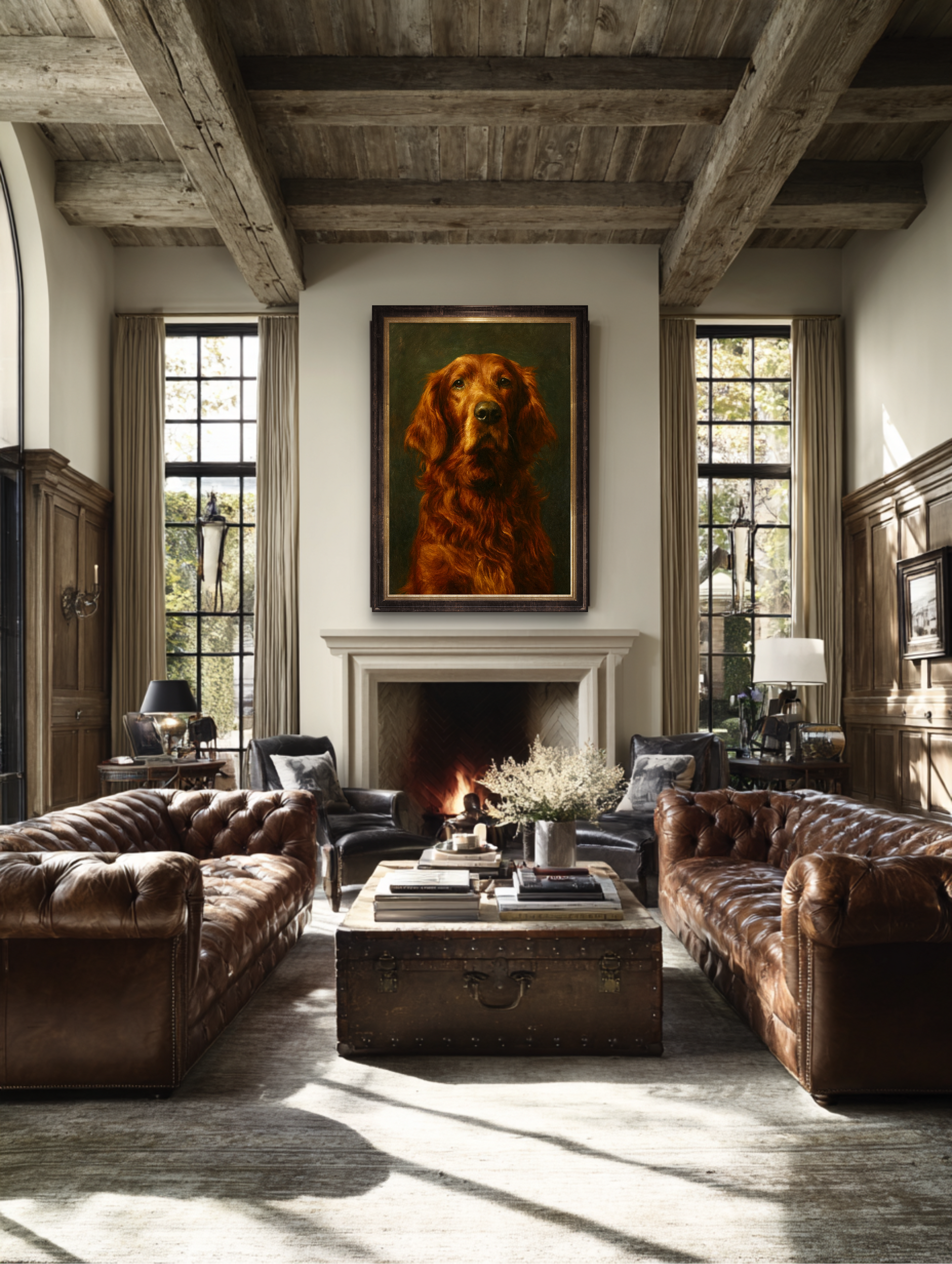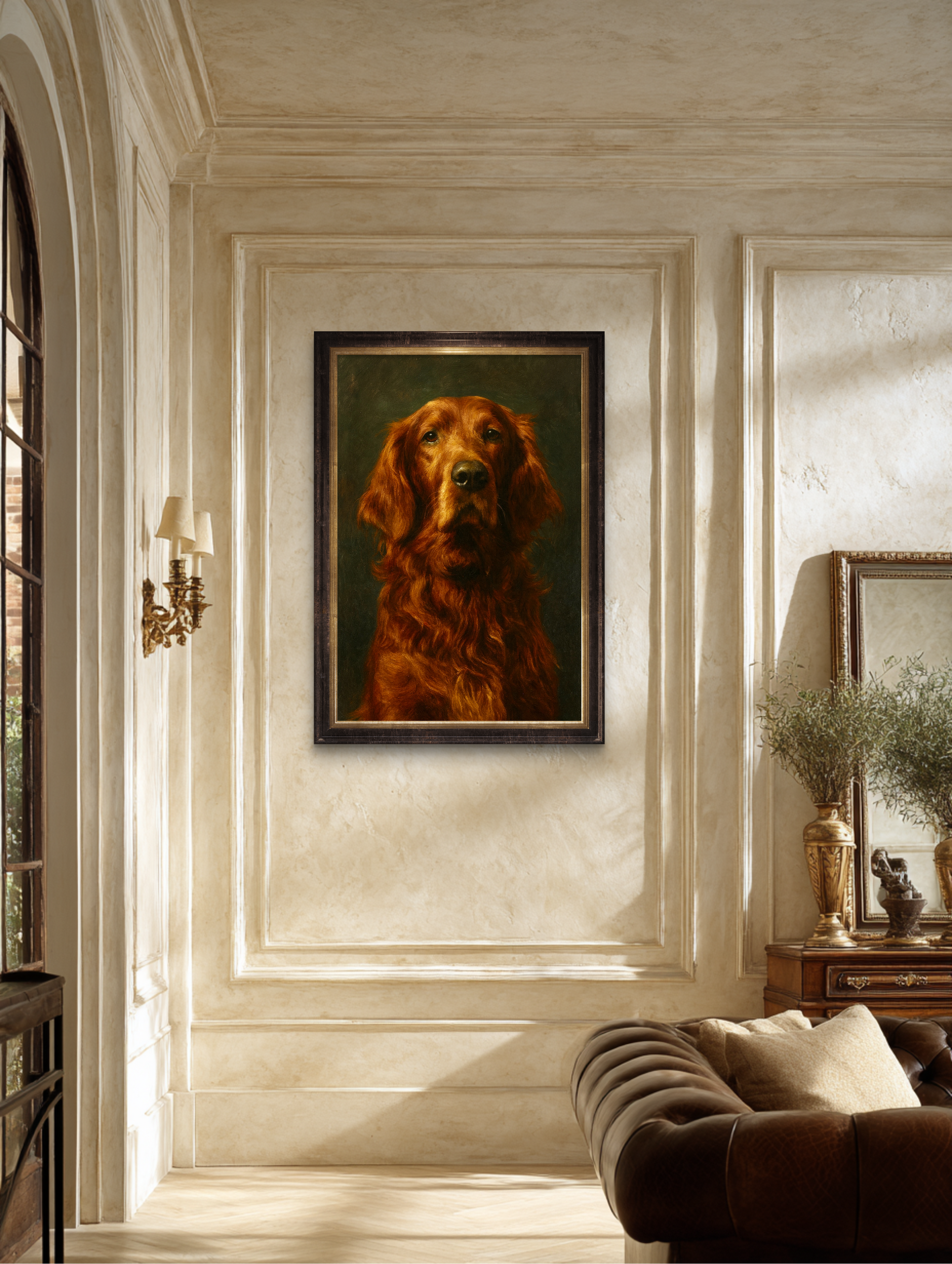 There are certain dogs who do not merely live in a home, they haunt it, quietly, nobly, like the lingering scent of pipe smoke or the distant echo of a violin after midnight. “Liam,” the Irish Setter immortalized here, is one of those rare souls. His gaze speaks not of obedience or play, but of ancient loyalty, a quiet, knowing melancholy that has watched countless sunsets over the green hills of County Kerry.