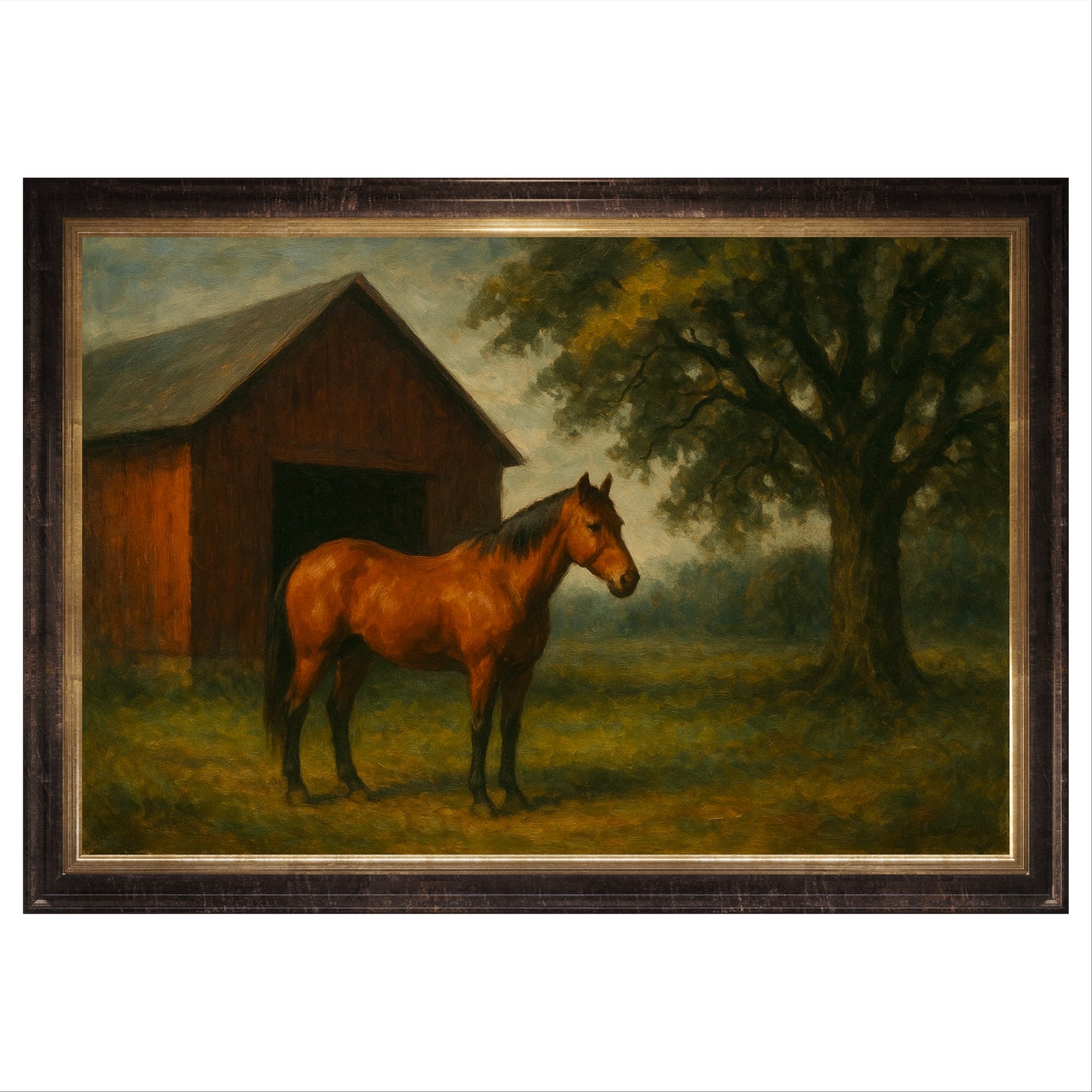 This 19th-century–style oil painting captures a chestnut horse standing nobly before a weathered red barn, the afternoon light caught somewhere between nostalgia and permanence. The kind of scene that makes you wonder who owned the place, and whether the whiskey was as good as the woodwork.