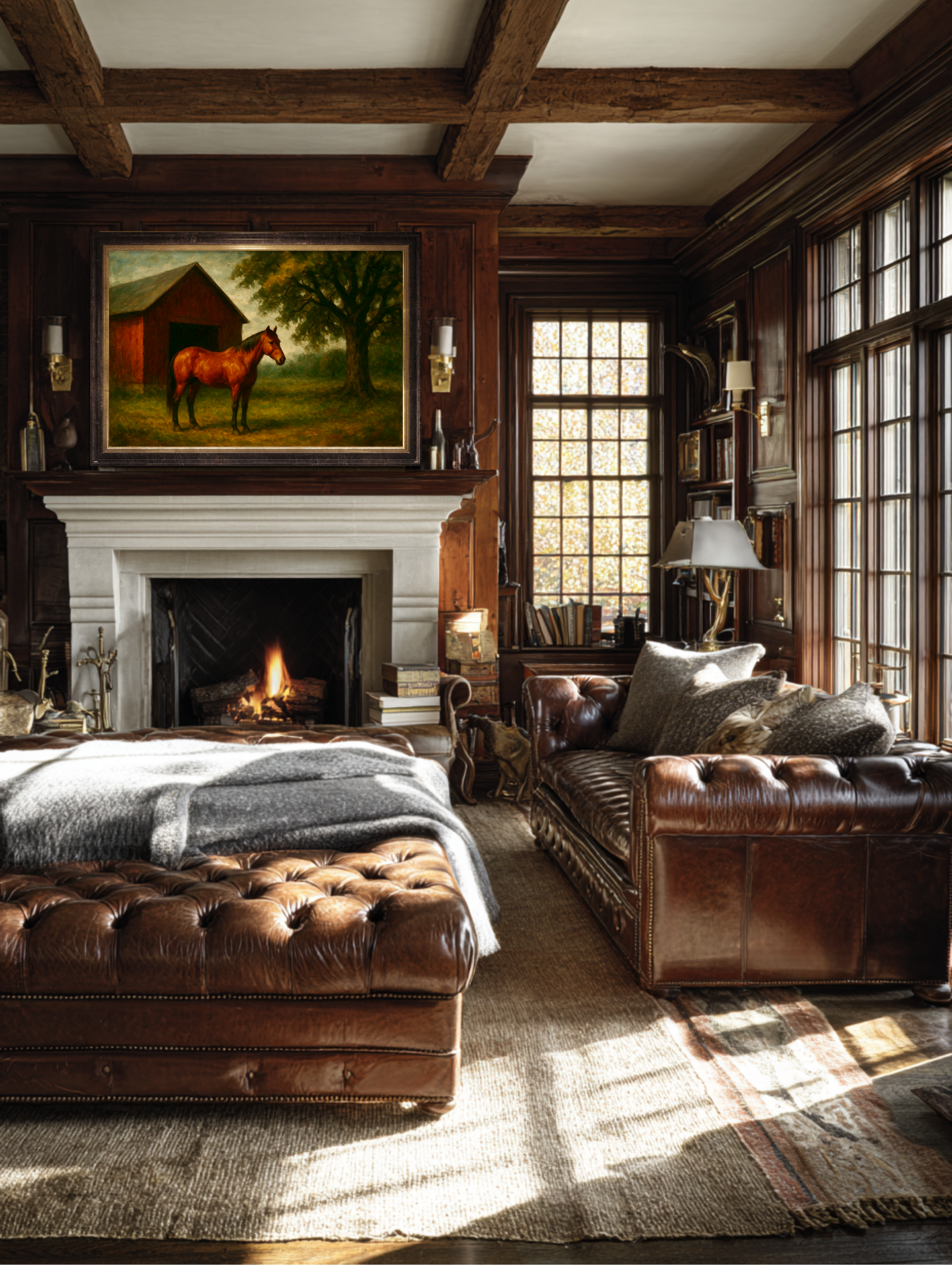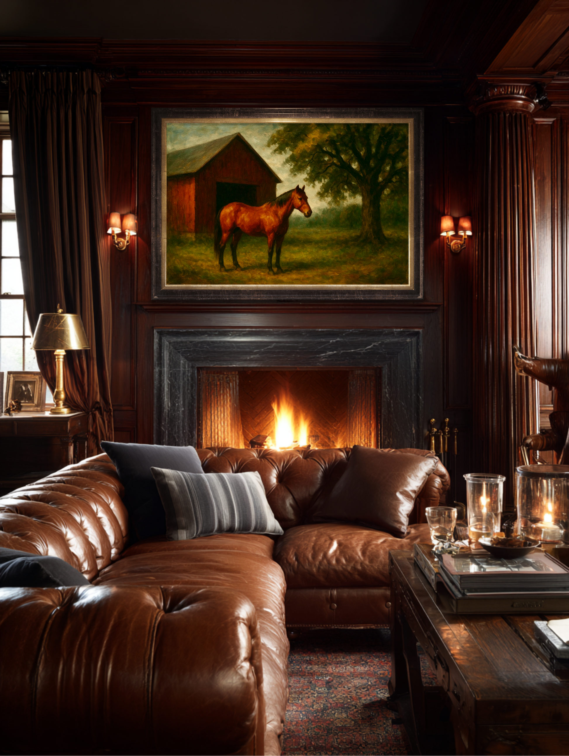 Best displayed above a fireplace, in a paneled study, or along a grand hallway where it can stare down lesser décor with quiet authority. It brings with it that unmistakable warmth and old-world luxury found only in country estates, coastal retreats, and gentleman’s libraries—the sort of places where the rugs are older than the guests.