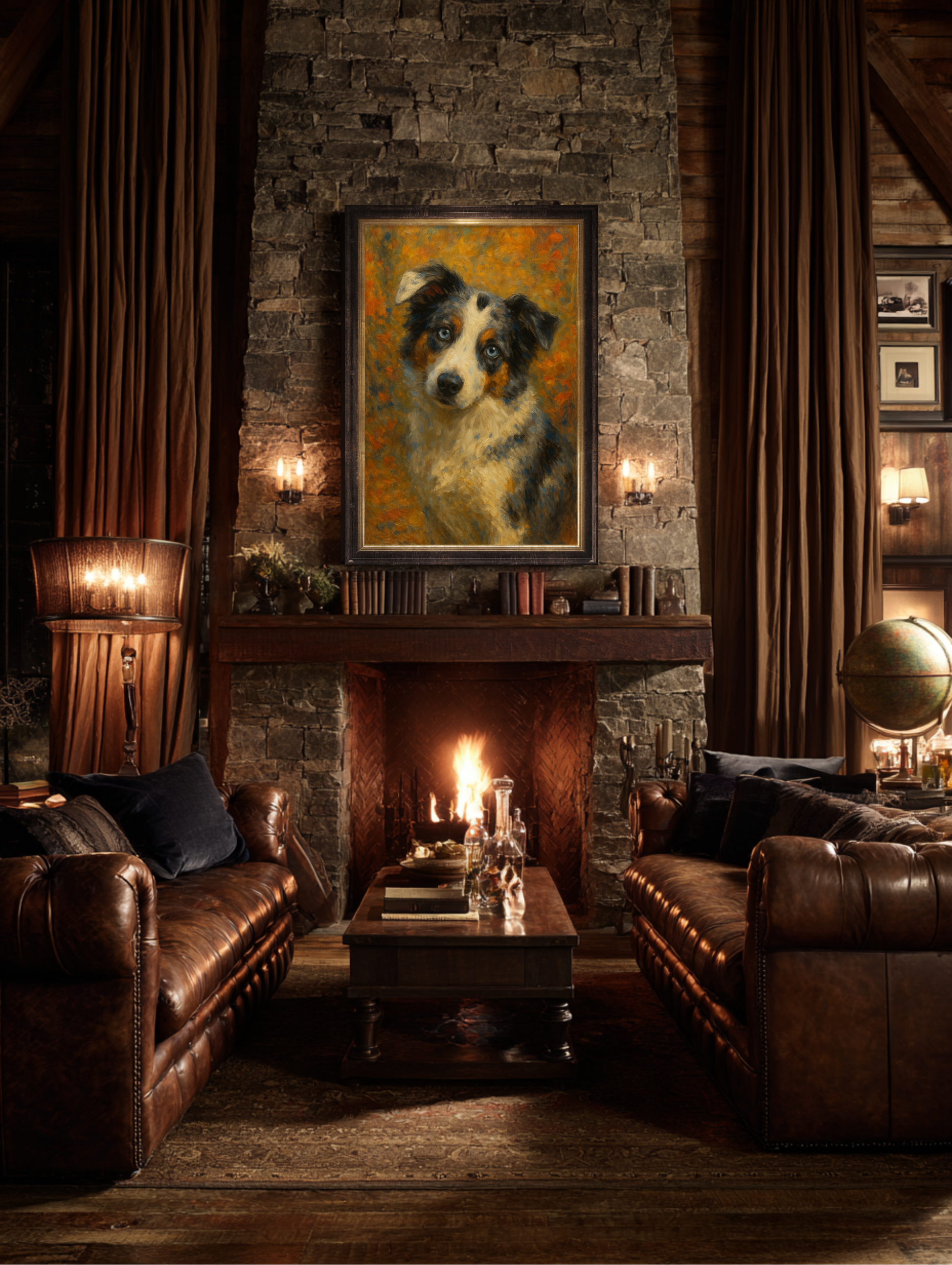 Created through AI-driven artistic prompts, this portrait combines modern craftsmanship with timeless tradition—a piece made to last, much like the dog who inspired it.