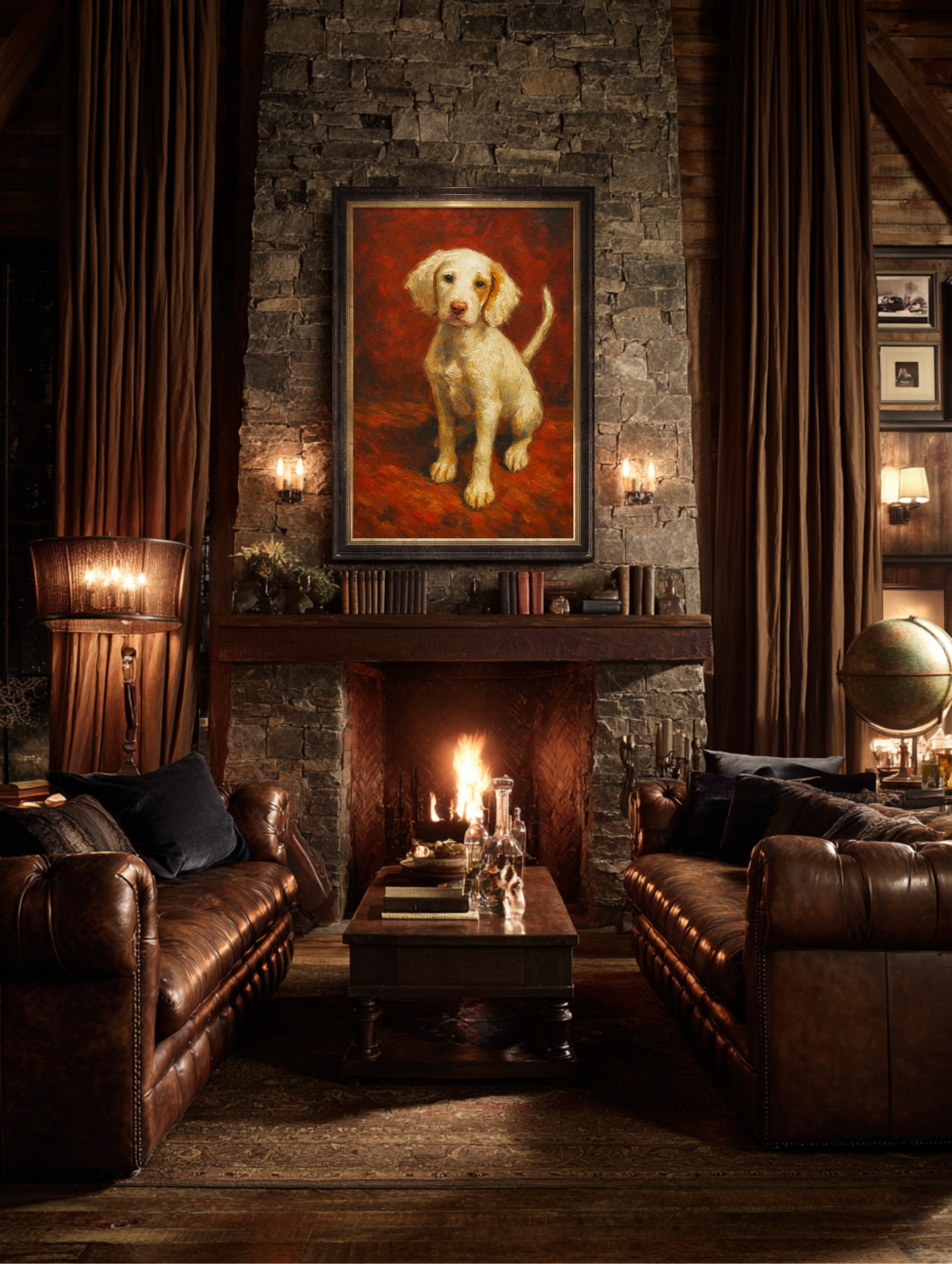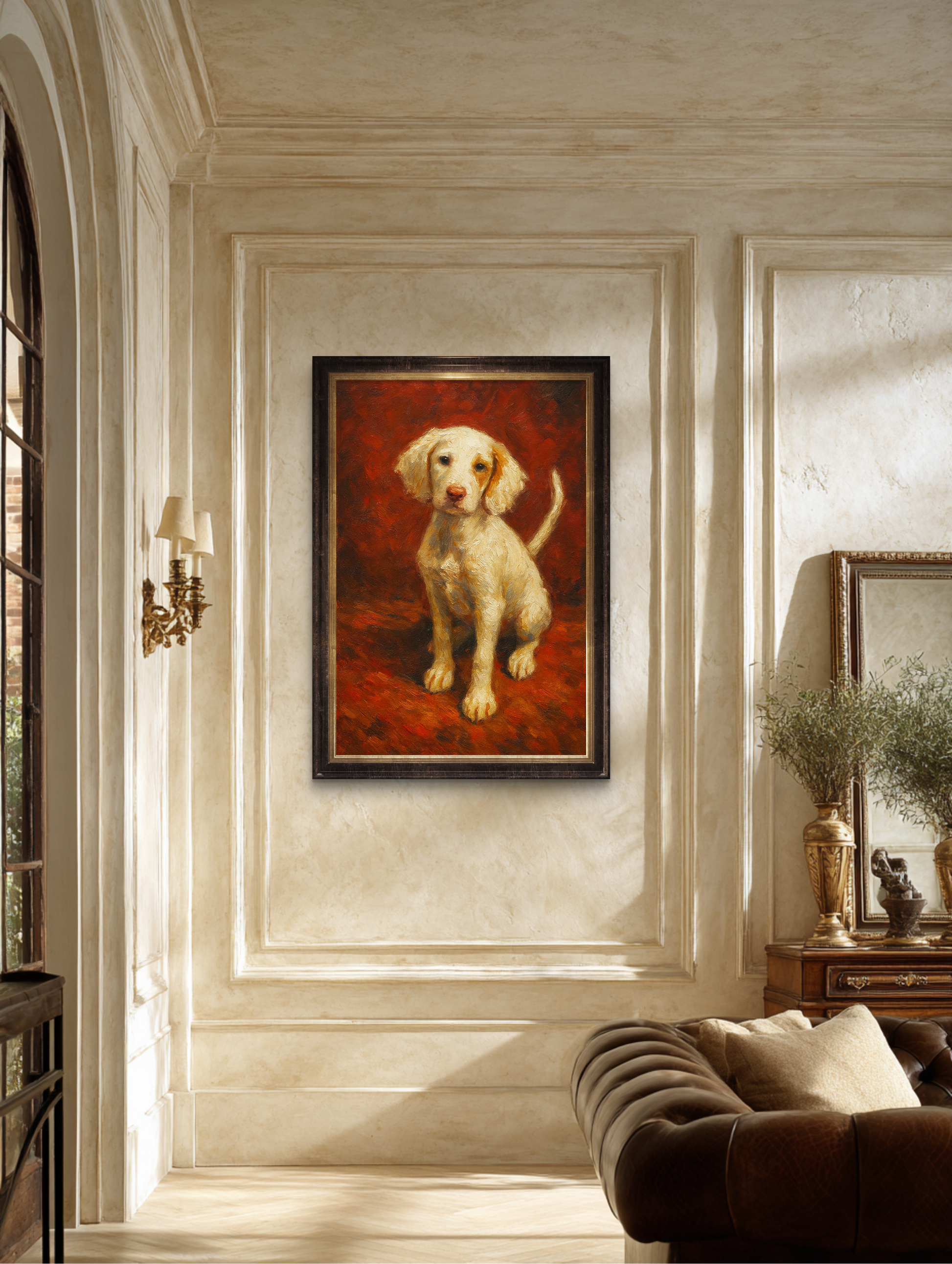 Some dogs are born to fetch. Sammy was born to pose. One look at those eyes and you realize, this is not merely a puppy, but the sort of loyal companion who would wait patiently by the fireplace while you pour yourself another bourbon. Captured in rich oil texture and set against a deep red backdrop that feels borrowed from a country estate, this portrait brings warmth, wit, and a hint of mischief into any room.
